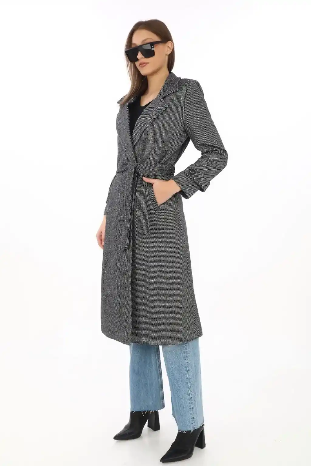 Kadın Balık Sırtı Kaşe Kaban – Uzun Boy Kruvaze Yaka Kuşaklı Astarlı Kışlık Tesettür Kaban, Yünlü Dokuma Kaşmir Kumaş, Cepli Rahat Oversize Kalıp Şık Modern Kaban Mont Modeli (Günlük ve Özel Gün Kombinlerine Uygun) - Füme
