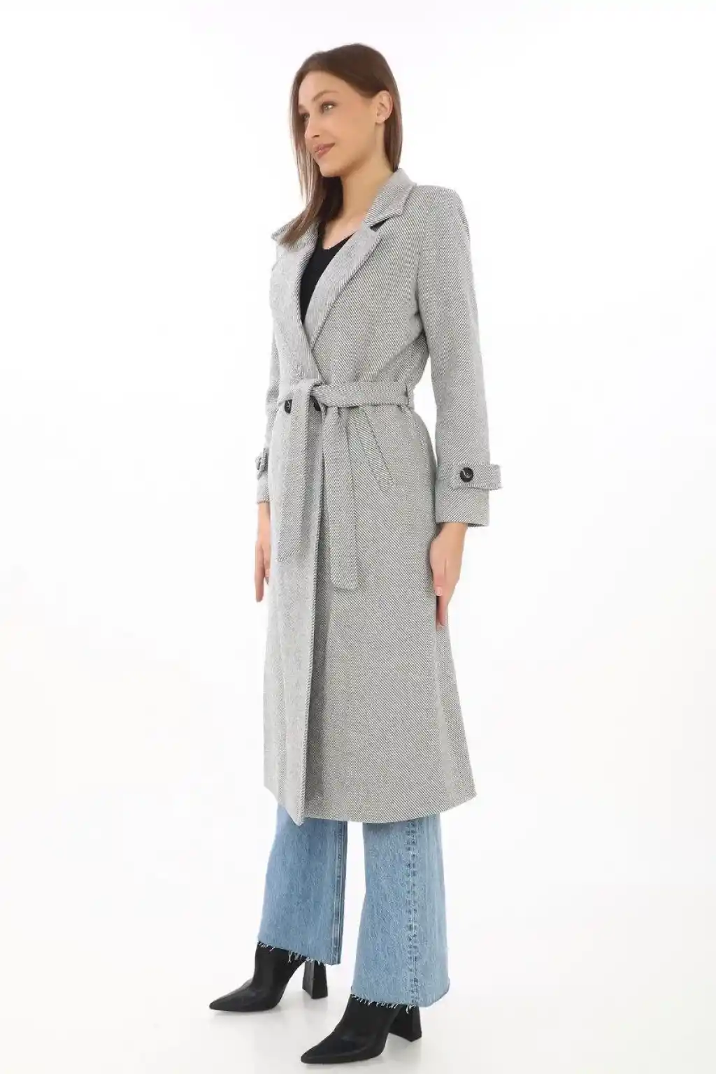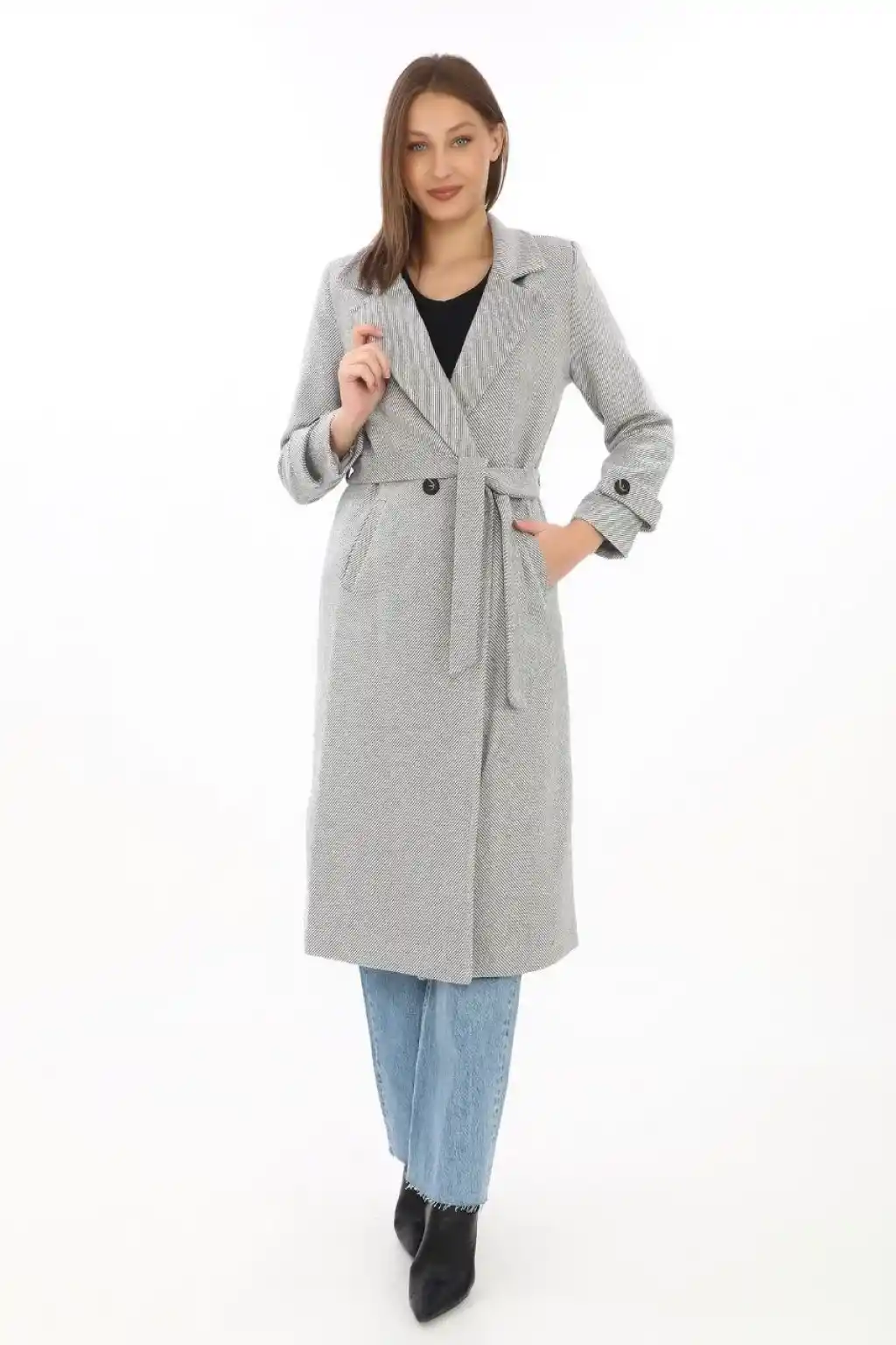Kadın Balık Sırtı Kaşe Kaban – Uzun Boy Kruvaze Yaka Kuşaklı Astarlı Kışlık Tesettür Kaban, Yünlü Dokuma Kaşmir Kumaş, Cepli Rahat Oversize Kalıp Şık Modern Kaban Mont Modeli (Günlük ve Özel Gün Kombinlerine Uygun) - Gri