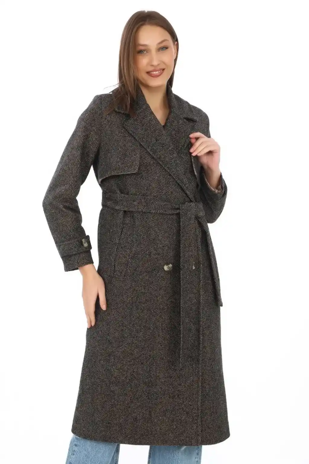Kadın Balık Sırtı Yünlü Dokuma Kaşe Kaban – Kruvaze Yaka, Kuşaklı, Cepli, Astarlı Uzun Boy Tesettür Şık Kışlık Kaşe Kaban Modeli - Kahverengi