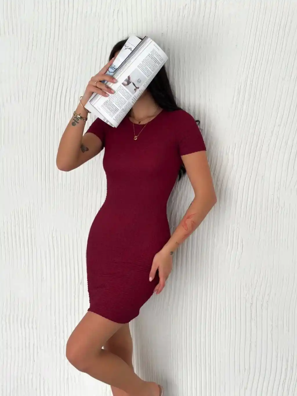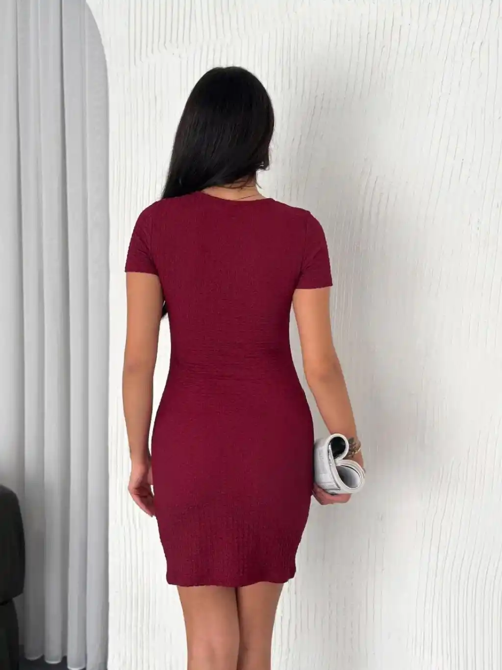Kadın Bisiklet Yaka Kısa Kol Likralı Elbise - Bordo