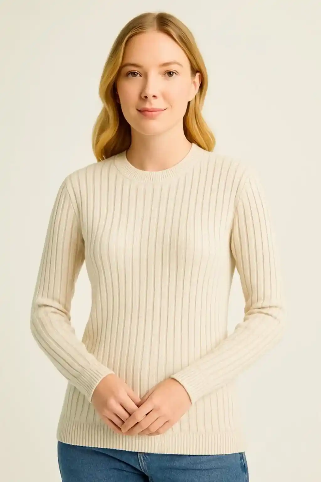 Kadın Bisiklet Yuvarlak Yaka Triko Kazak Pamuklu Kalın Fitilli Dokuma, Regular Fit Uzun Kollu Kışlık Model - Bej