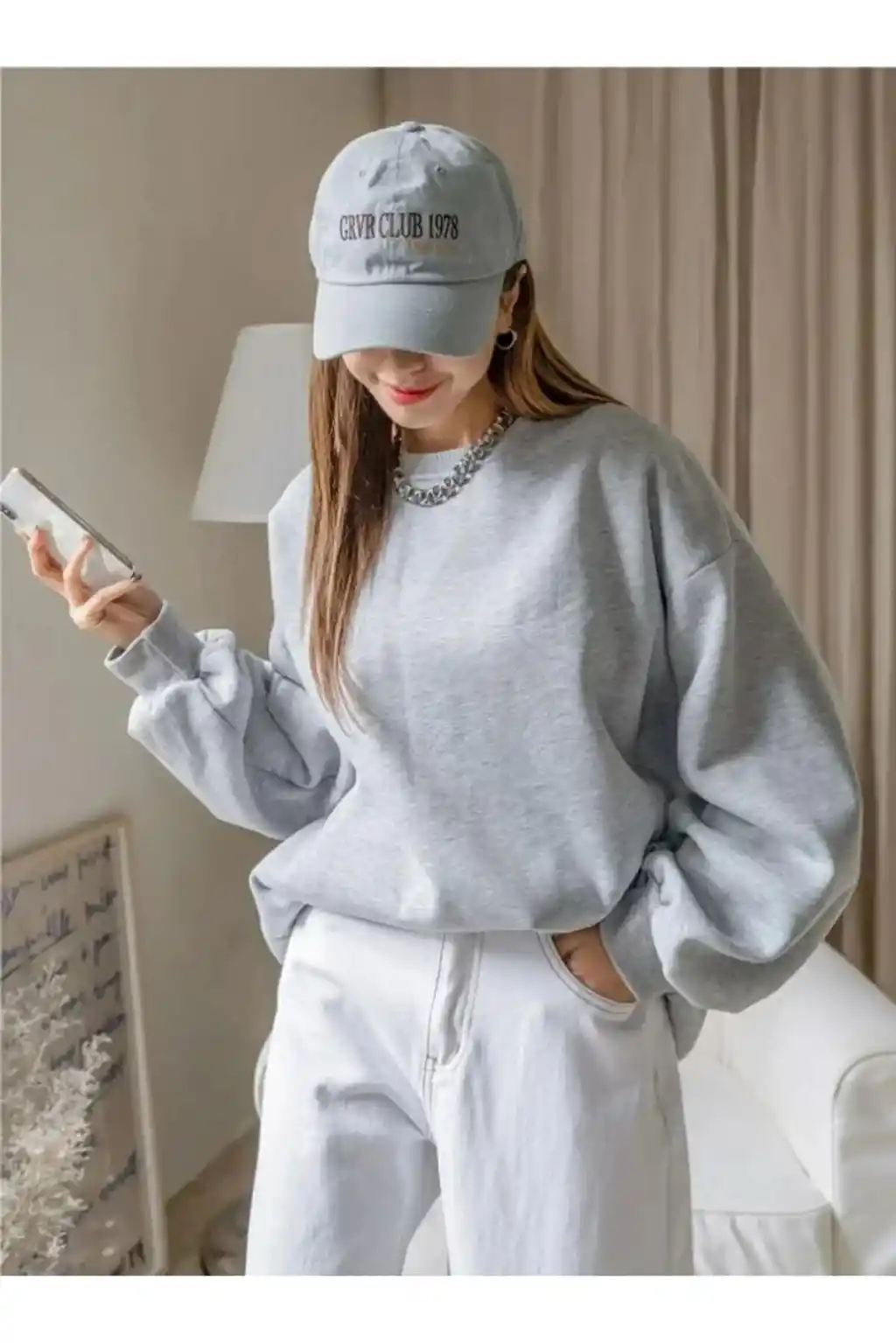 Kadın Düz Bisiklet Yaka Sweat - Gri