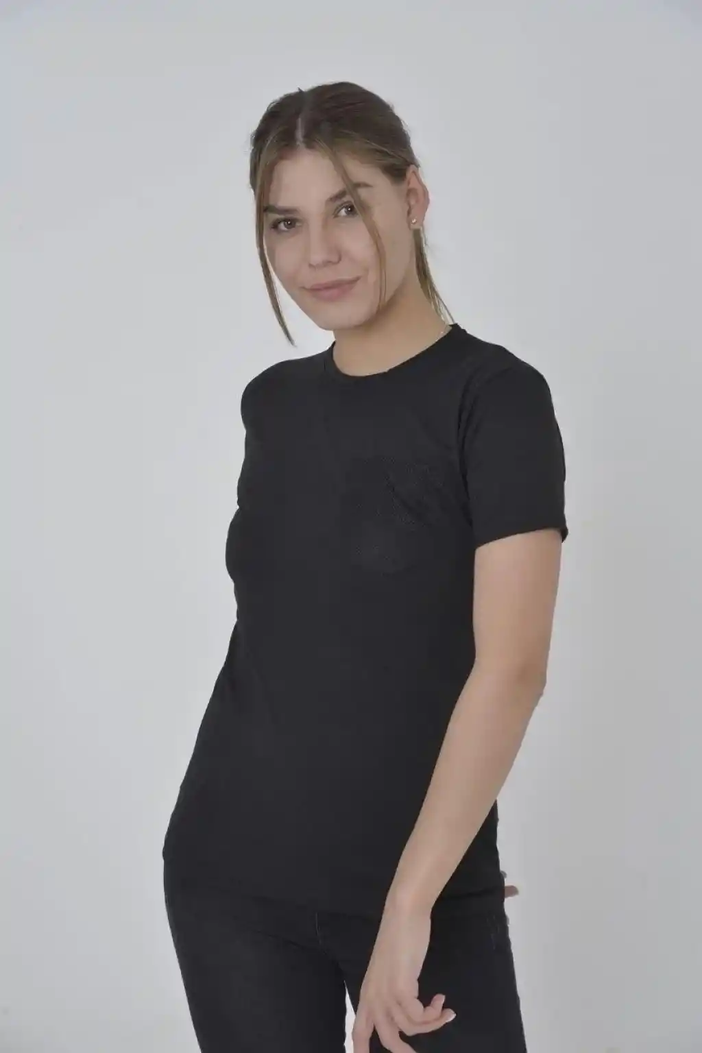 Kadın File Cepli Slim fit T-shirt - Siyah
