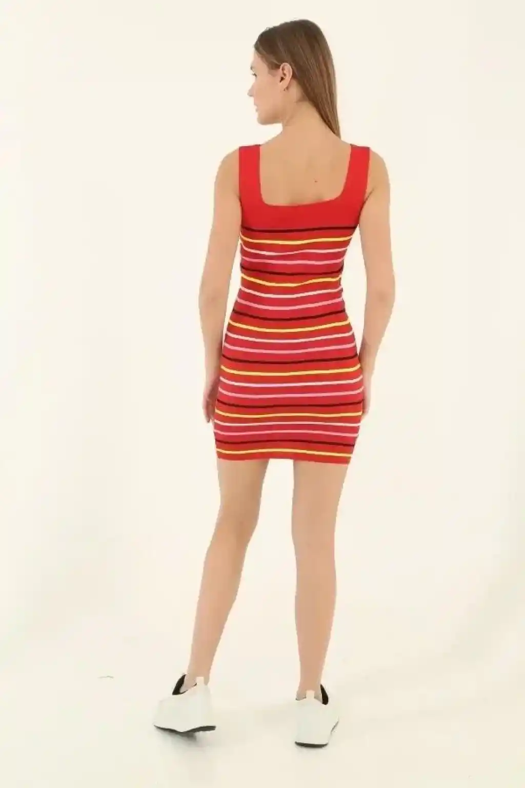 Kadın Kare Yaka Midi Boy Likralı Polelit Elbise - Kırmızı