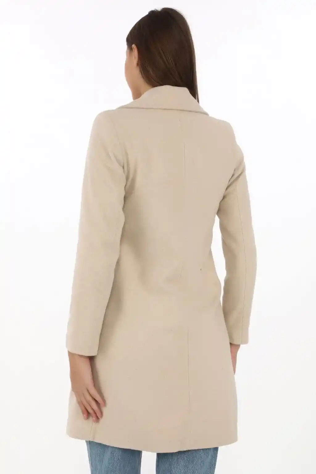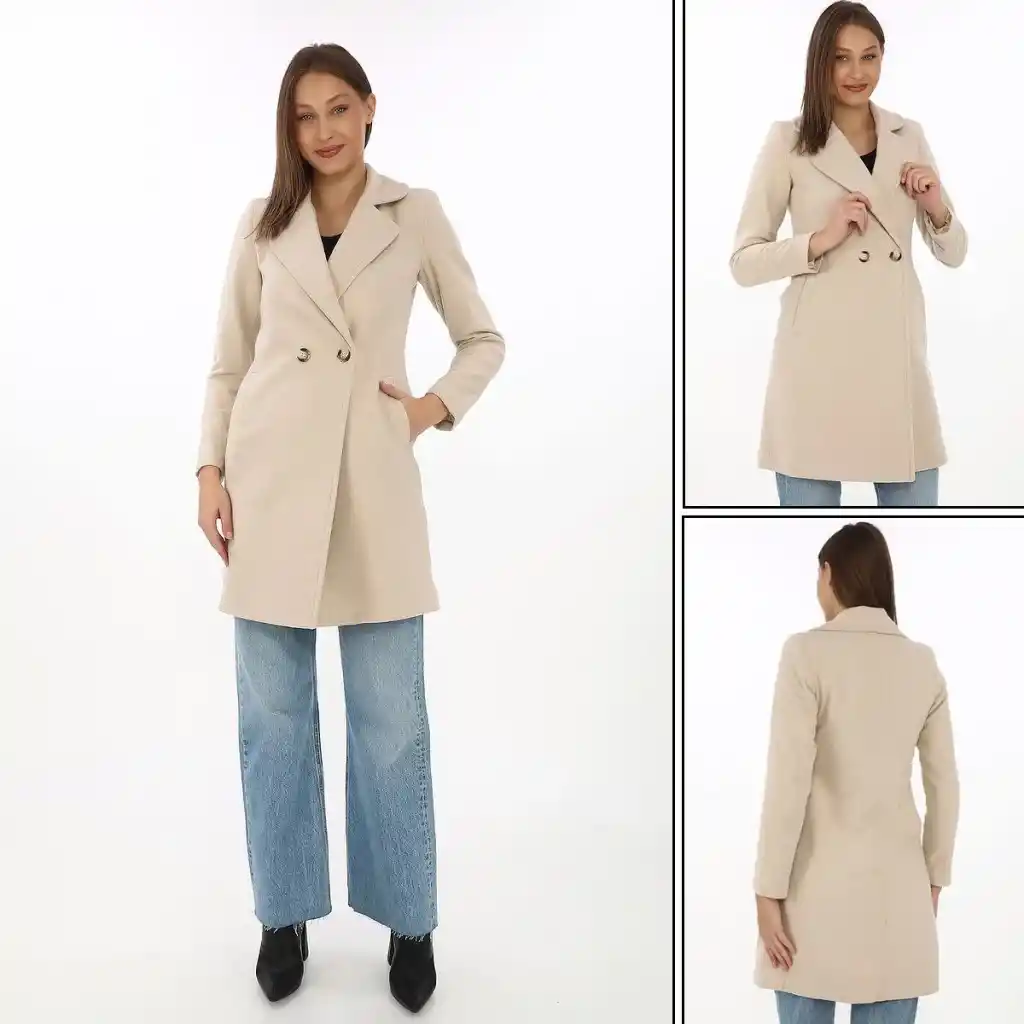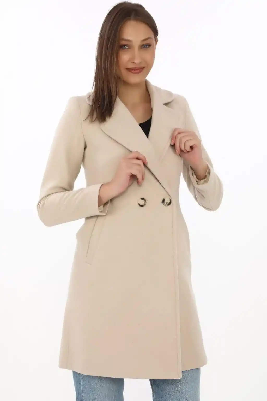 Kadın Kaşe Kaban – Siyah Yünlü Dokuma, Kruvaze Yaka, Astarlı, Cepli, Kuşaklı Uzun Boy Tesettür Uyumlu Kışlık Şık Kaban - Bej