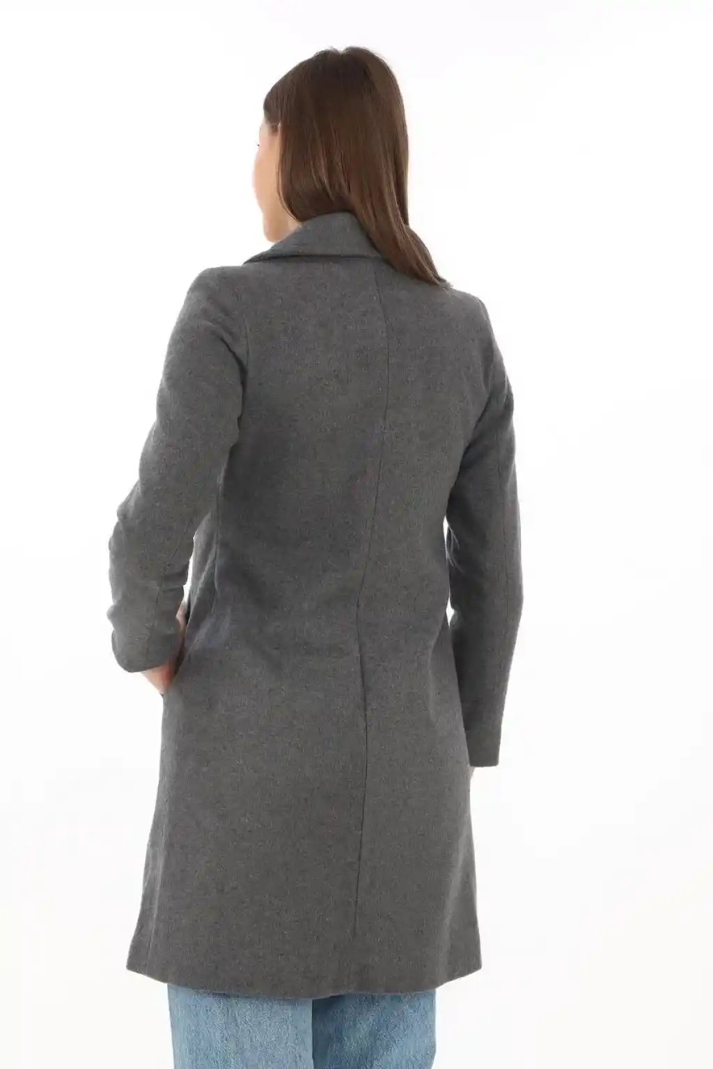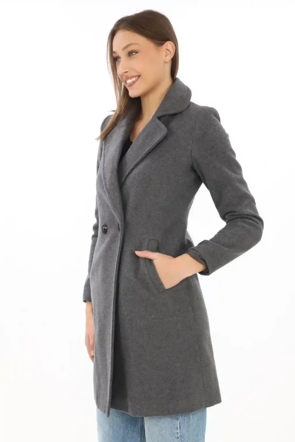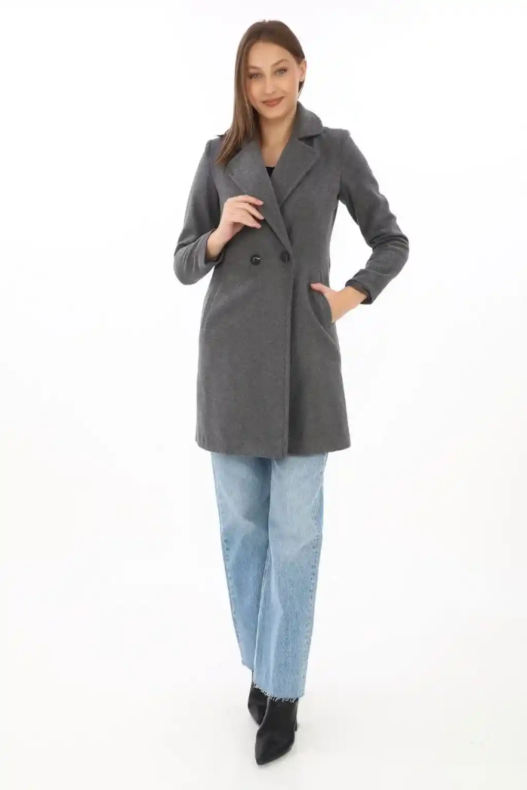 Kadın Kaşe Kaban – Siyah Yünlü Dokuma, Kruvaze Yaka, Astarlı, Cepli, Kuşaklı Uzun Boy Tesettür Uyumlu Kışlık Şık Kaban - Füme