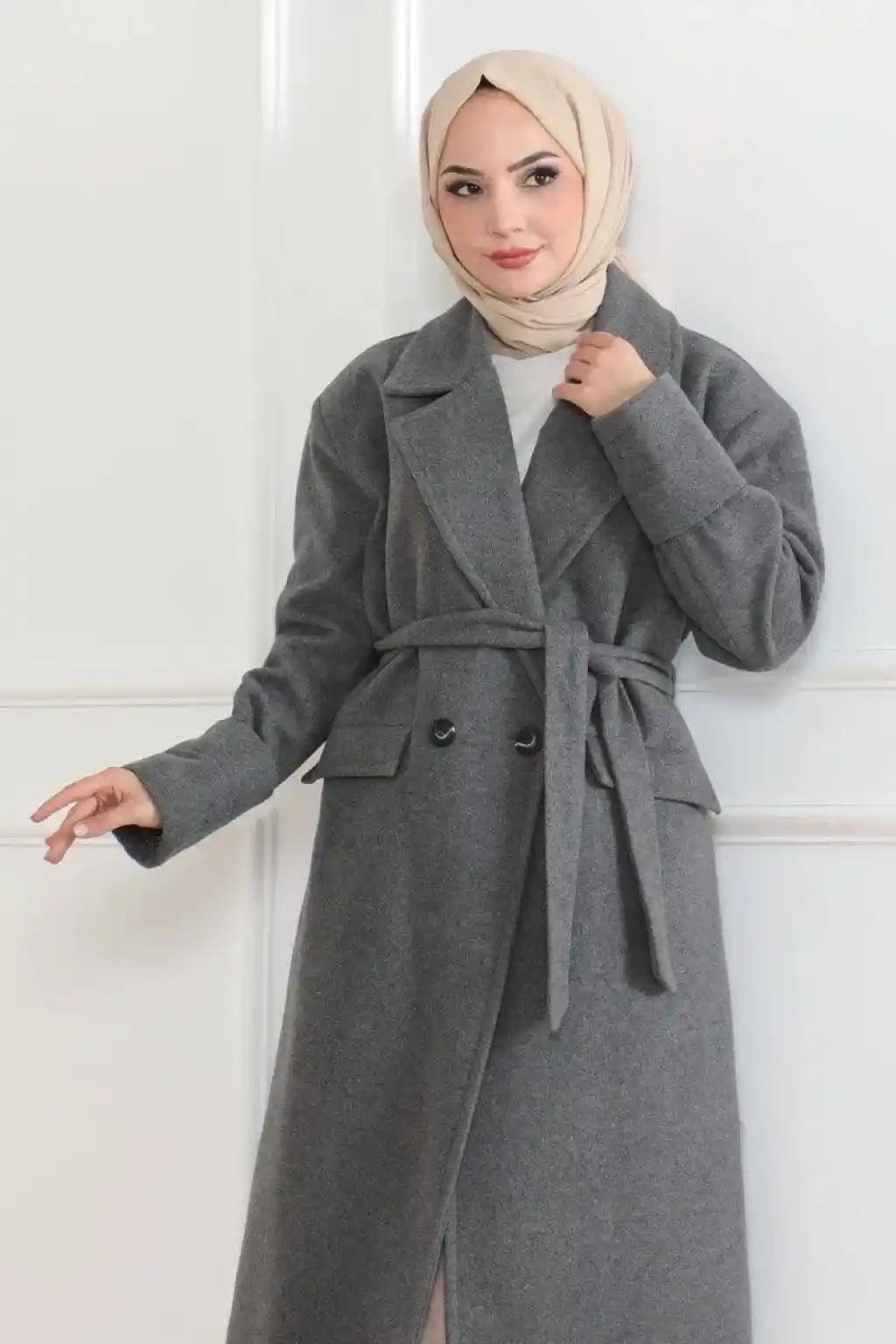Kadın Kaşe Kaban – Uzun Boy Kruvaze Yaka Kuşaklı Tesettür Kaşe Kışlık Kaban, Astarlı Şık Yünlü Dokuma Oversize Rahat Kalıp Cepli Düğmeli Modern Kap Modeli - Gri
