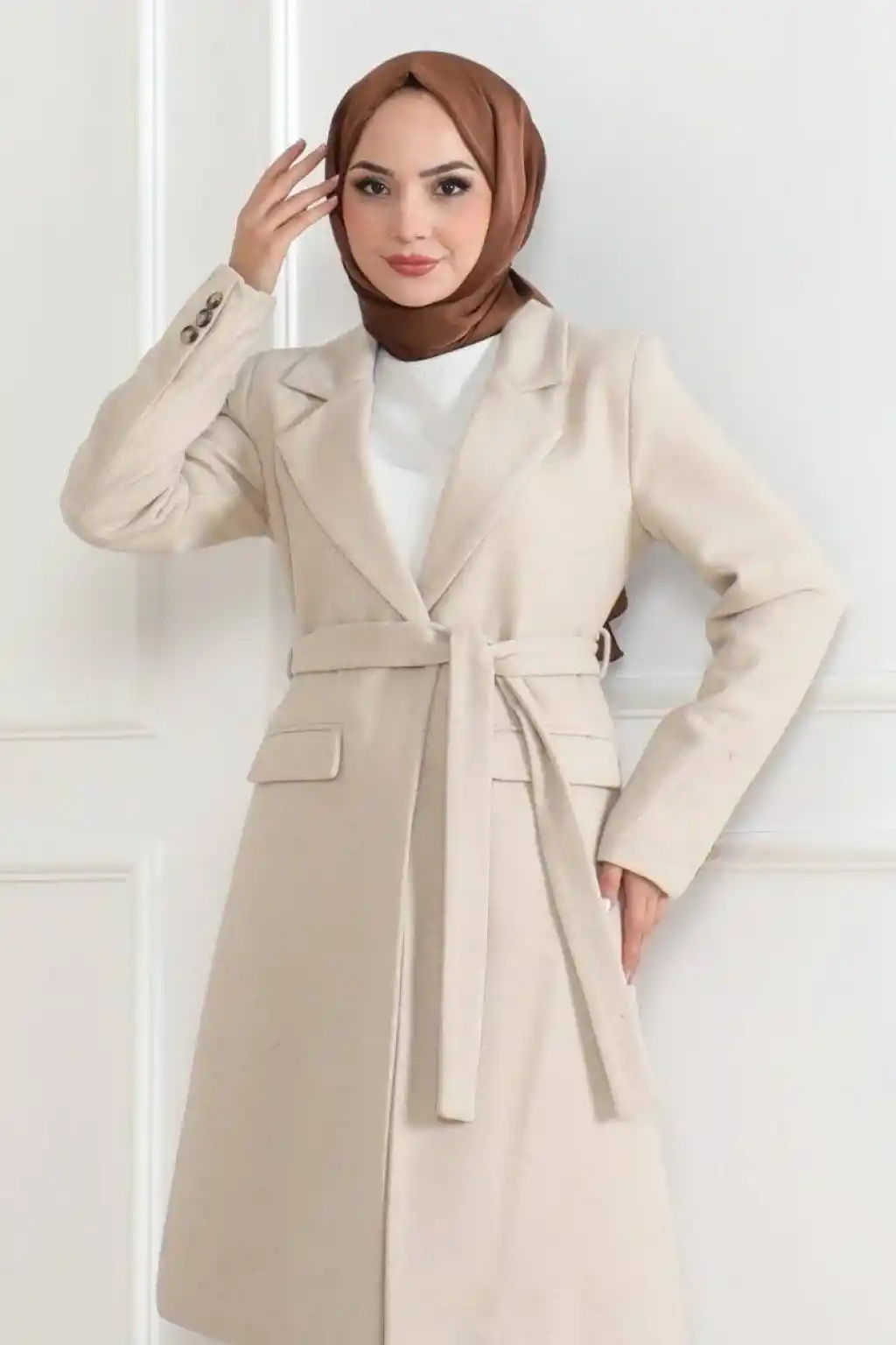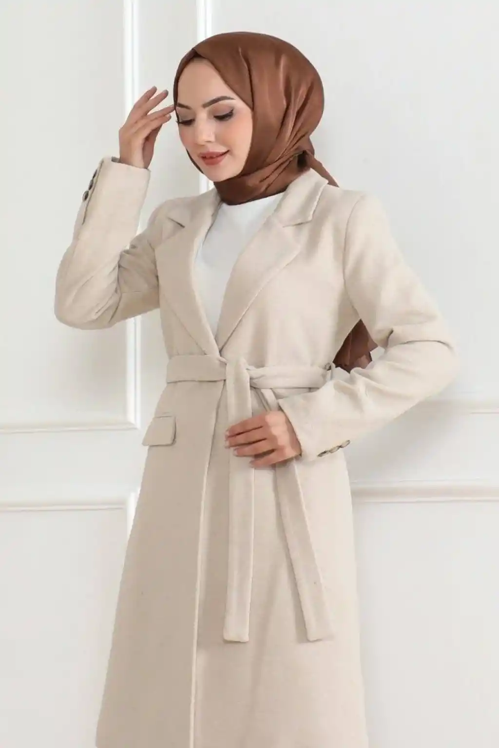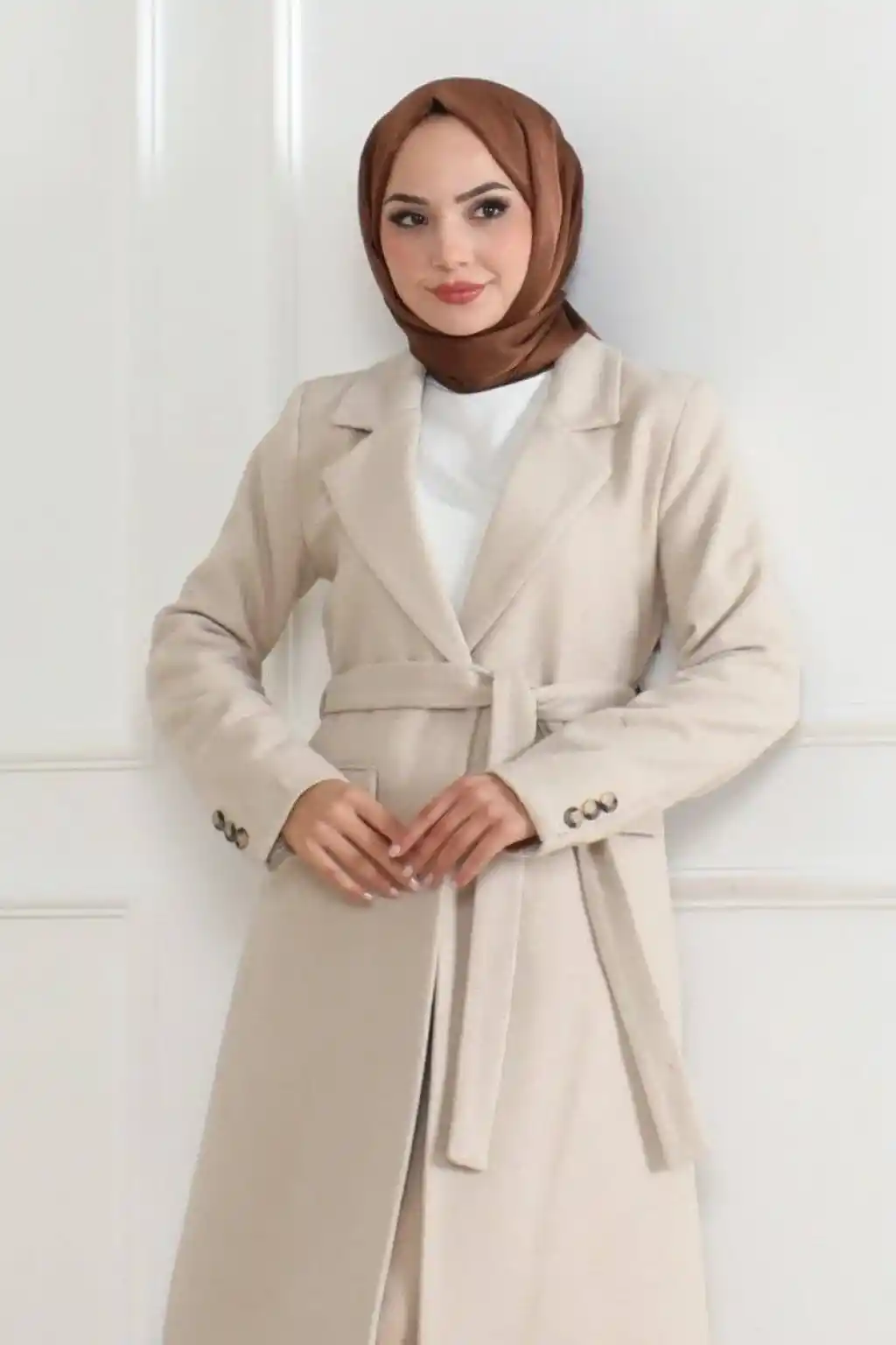 Kadın Kaşe Kaban – Uzun Boy Kruvaze Yaka, Kuşaklı Tesettür Kışlık Kaban, Astarlı Şık Yünlü Dokuma Oversize Rahat Kalıp, Cepli Modern Kaşe Mont Modeli - Bej