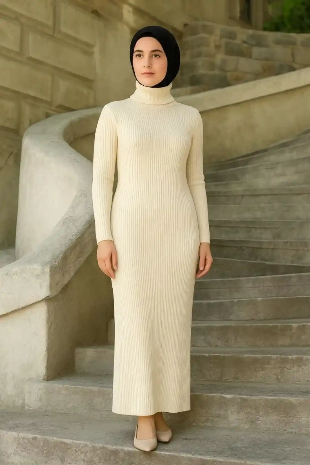 Kadın Tesettür Triko Elbise – Boğazlı Uzun Fitilli Dokuma, Esnek Tam Kalıp, 130 cm Midi Boy, Bahar & Kış Şık Rahat Stil - Beyaz
