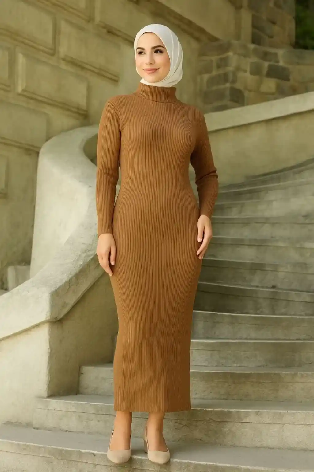 Kadın Tesettür Triko Elbise – Boğazlı Uzun Fitilli Dokuma, Esnek Tam Kalıp, 130 cm Midi Boy, Bahar & Kış Şık Rahat Stil - Kahverengi
