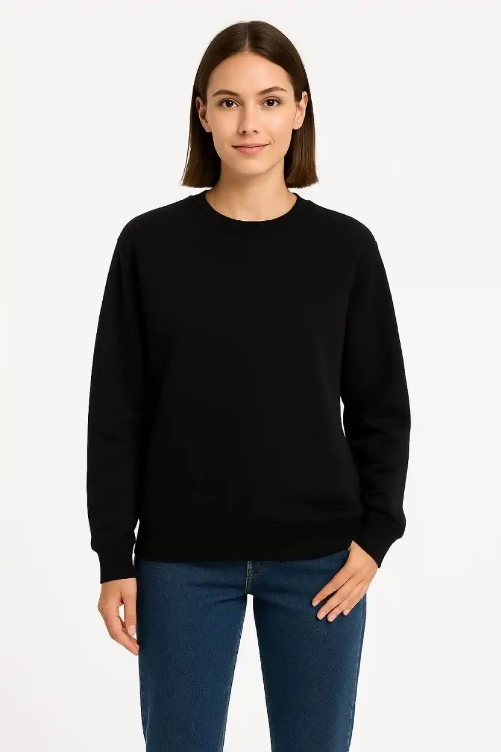 Kadın Üç İplik Düz Bisiklet Yaka SweatShirt - Siyah
