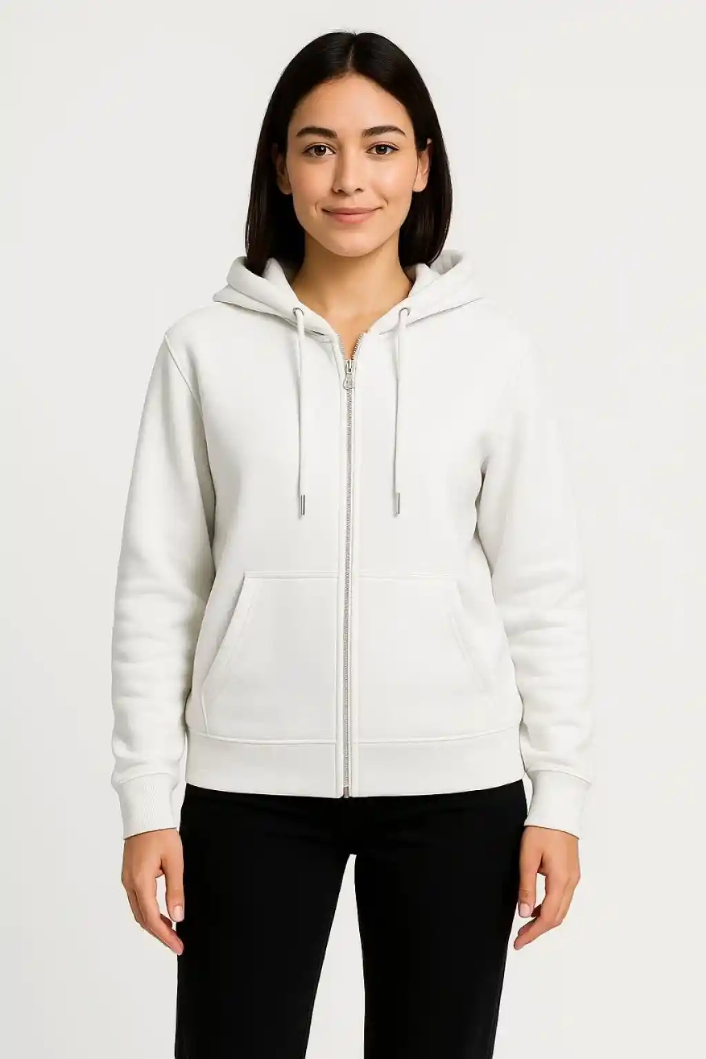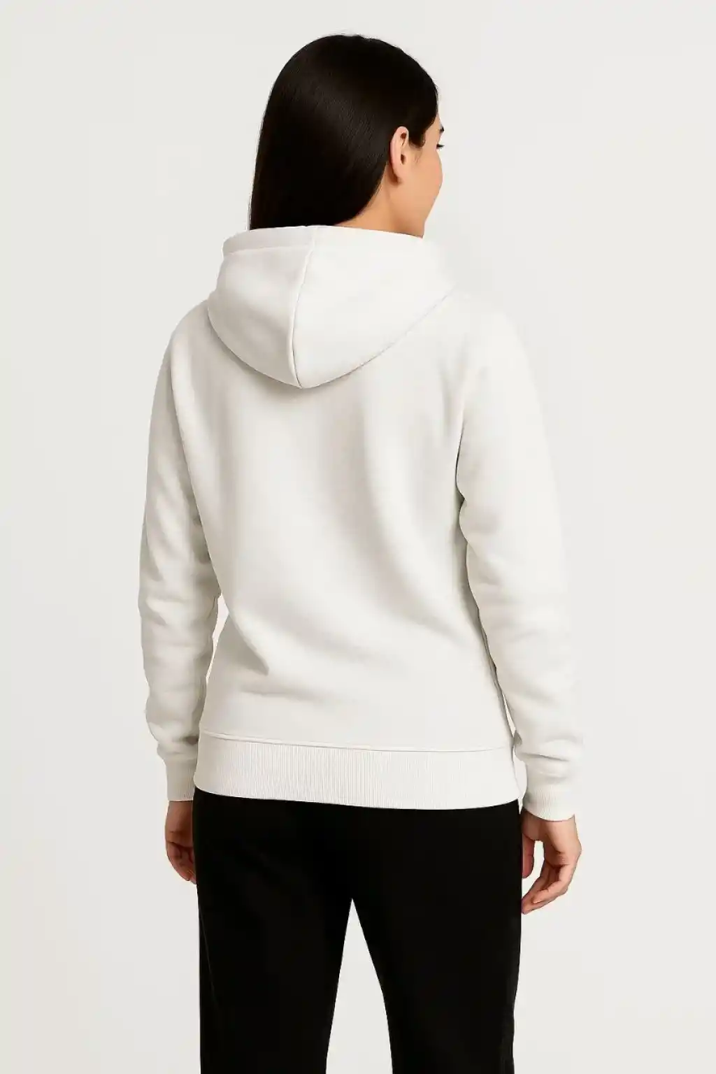 Kadın Üç İplik Kapüşonlu Tam Fermuarlı Kanguru Çepli SweatShirt Hoodie - Beyaz