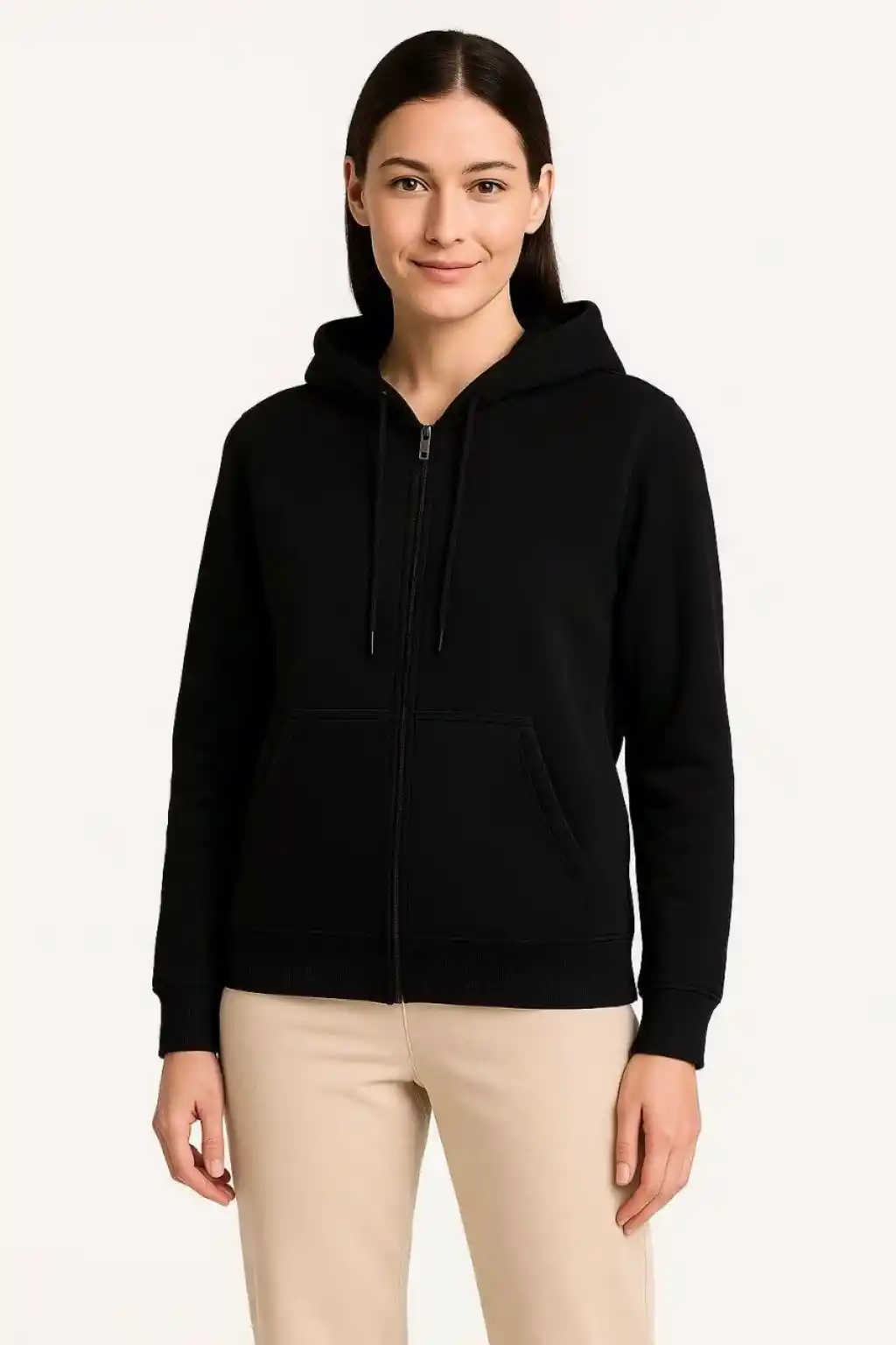 Kadın Üç İplik Kapüşonlu Tam Fermuarlı Kanguru Çepli SweatShirt Hoodie - Siyah
