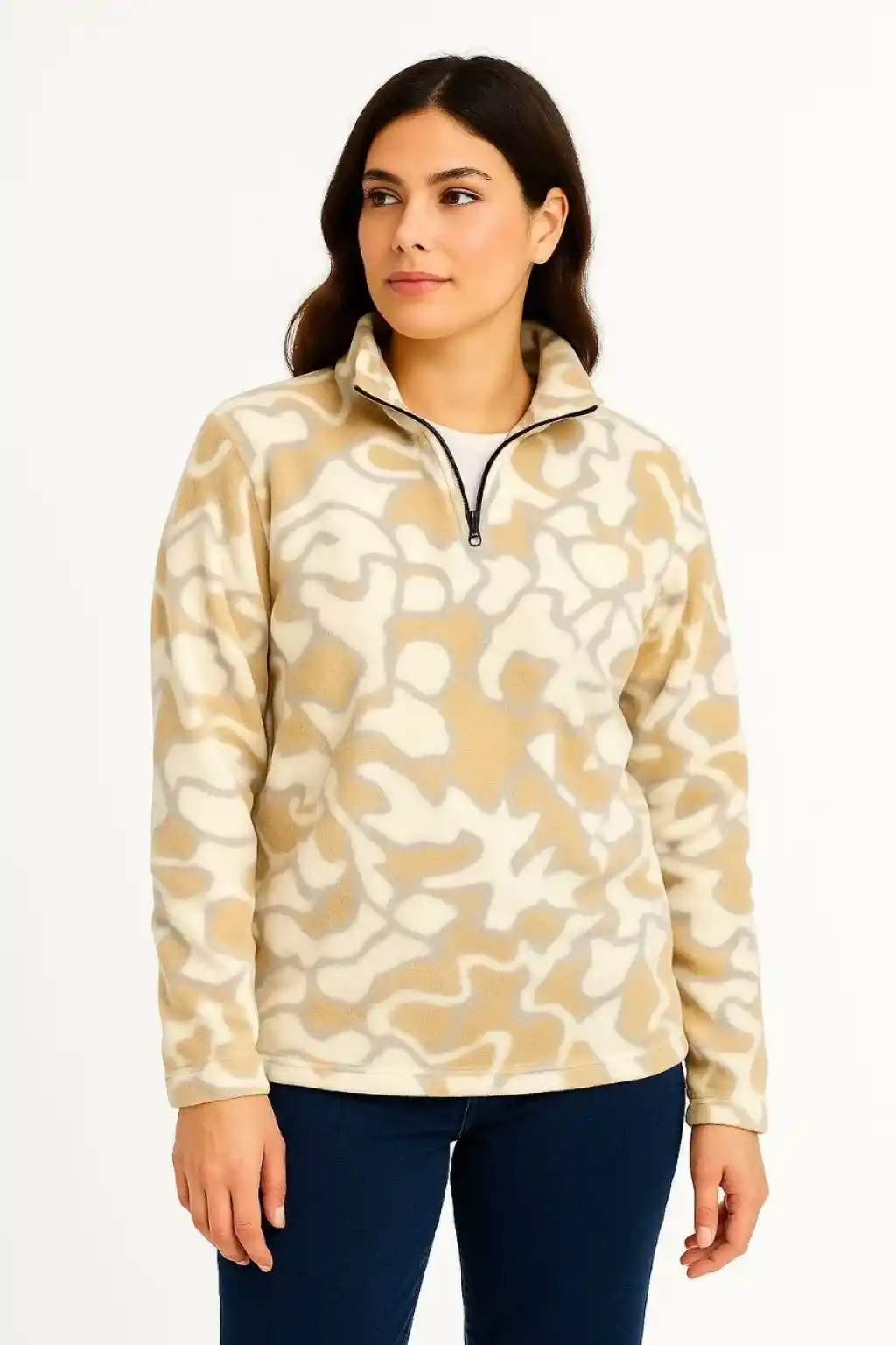 KADIN Yarım Fermuarlı Desenli Polar Sweat Yakalı, Uzun Kollu, Oversize Rahat Kalıp - Bej