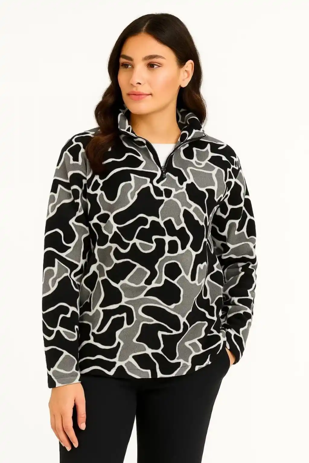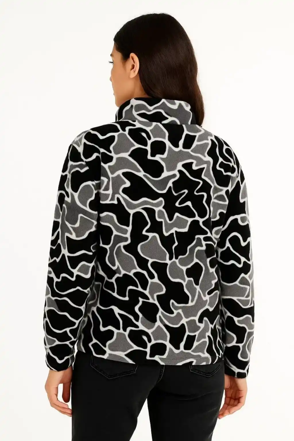 KADIN Yarım Fermuarlı Desenli Polar Sweat Yakalı, Uzun Kollu, Oversize Rahat Kalıp - Siyah