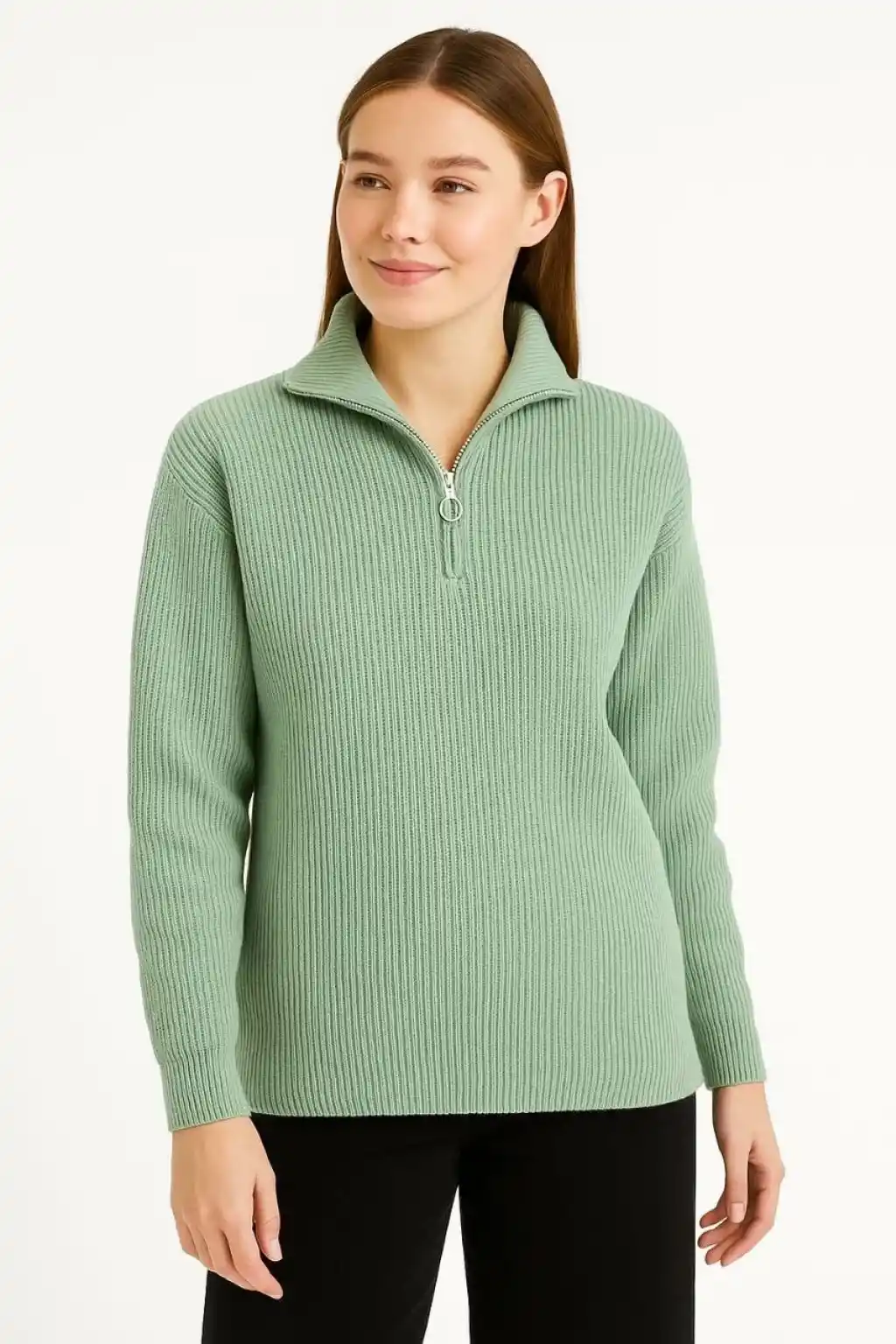 KADIN Yarım Fermuarlı Triko Kazak – Selanik Örgü, Dik Yaka, Pamuklu Dokuma, Oversize Uzun Kollu Kışlık Model - Mint Yeşili