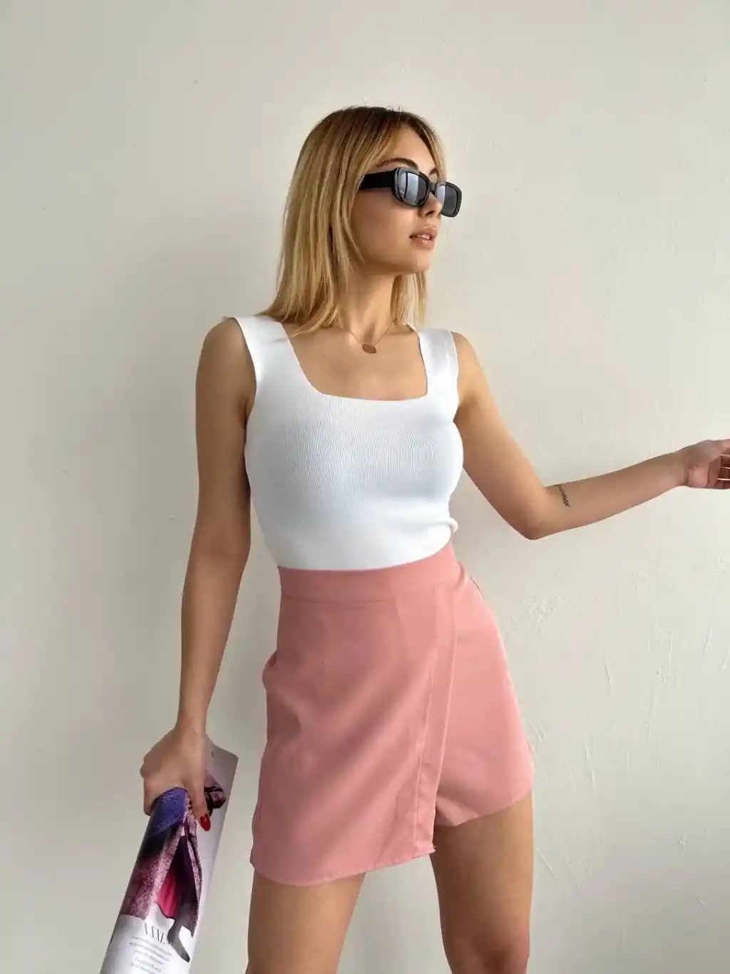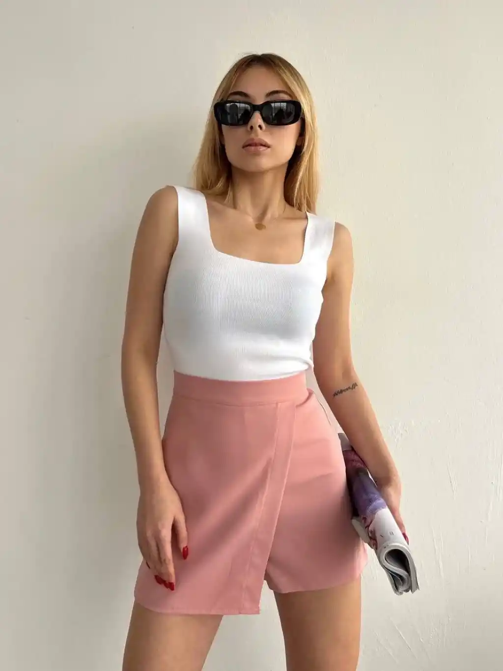 Kapaklı şort etek pudra S208, şıklık ve rahatlığı bir arada sunar.