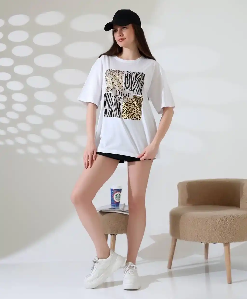 Her mevsim ve her kombinle kolayca uyum sağlayabilen Kazax karma desenli oversize tişört, gardırobunuzun vazgeçilmez parçalarından olacak.