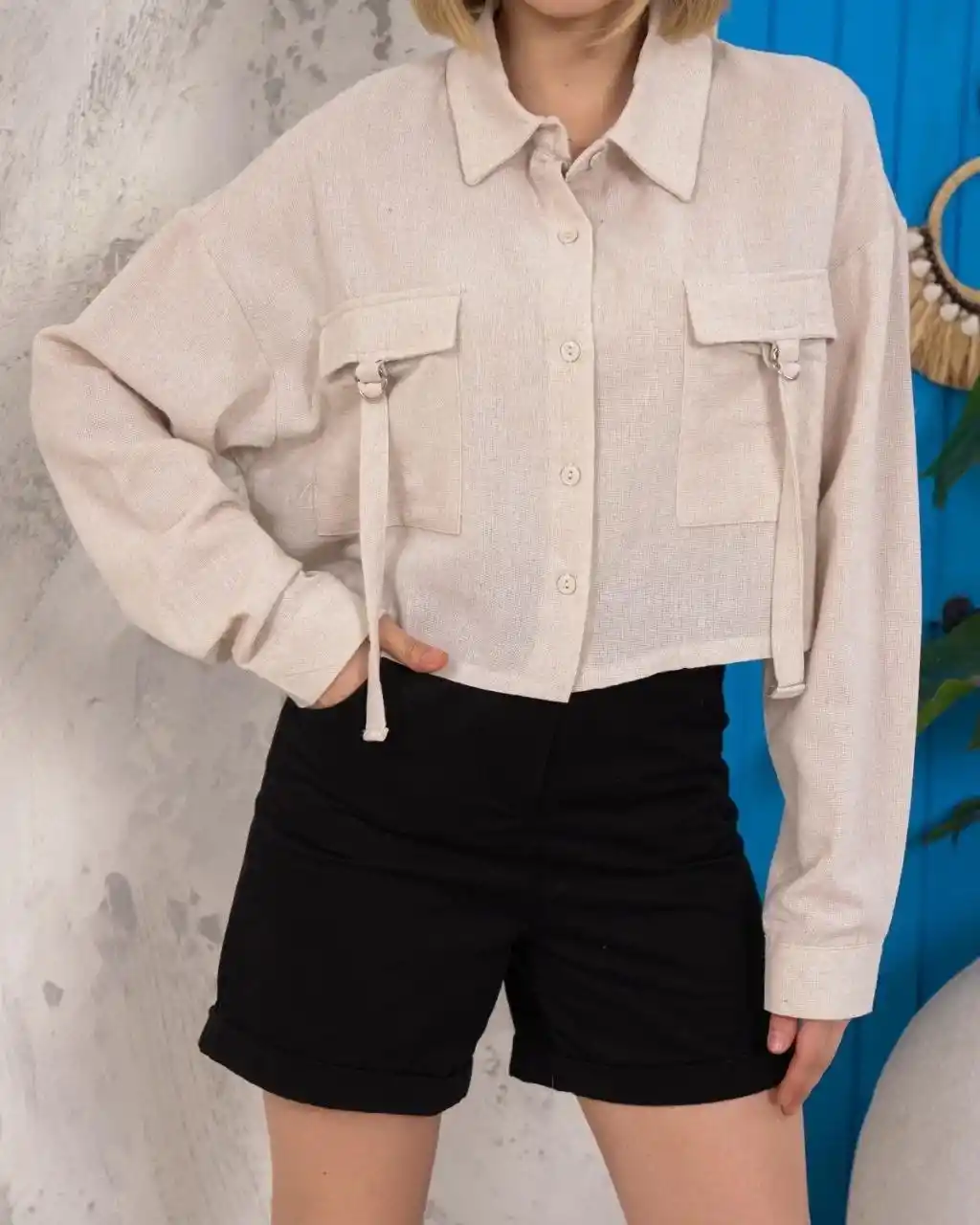 Kemer cepli keten crop gömlek krem s255350