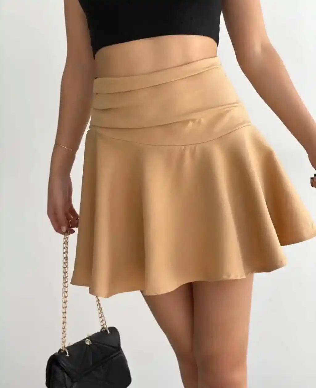 Kemerden büzgülü etek camel, stilinizi tamamlayacak şık bir seçenektir.