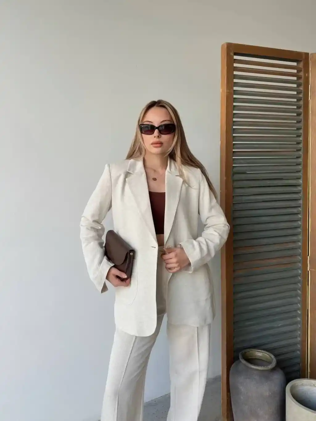 Keten Ceket Pantolon İlik Düğmeli Uzun Kollu Yırtmaçlı ikili Takım - Beyaz