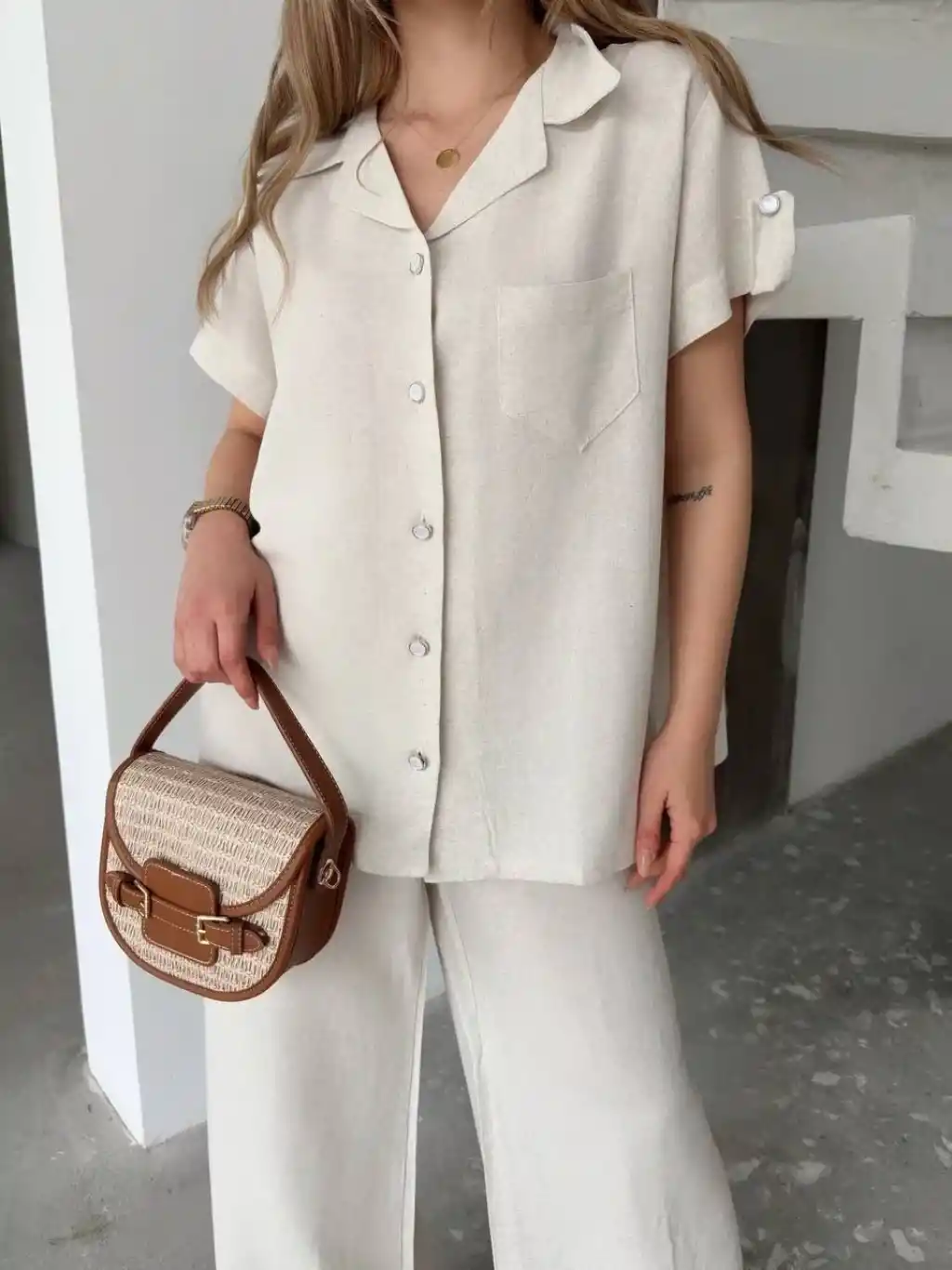 Keten Kısa Kollu Cepli Gömlek Pantolon ikili Takım - Beyaz