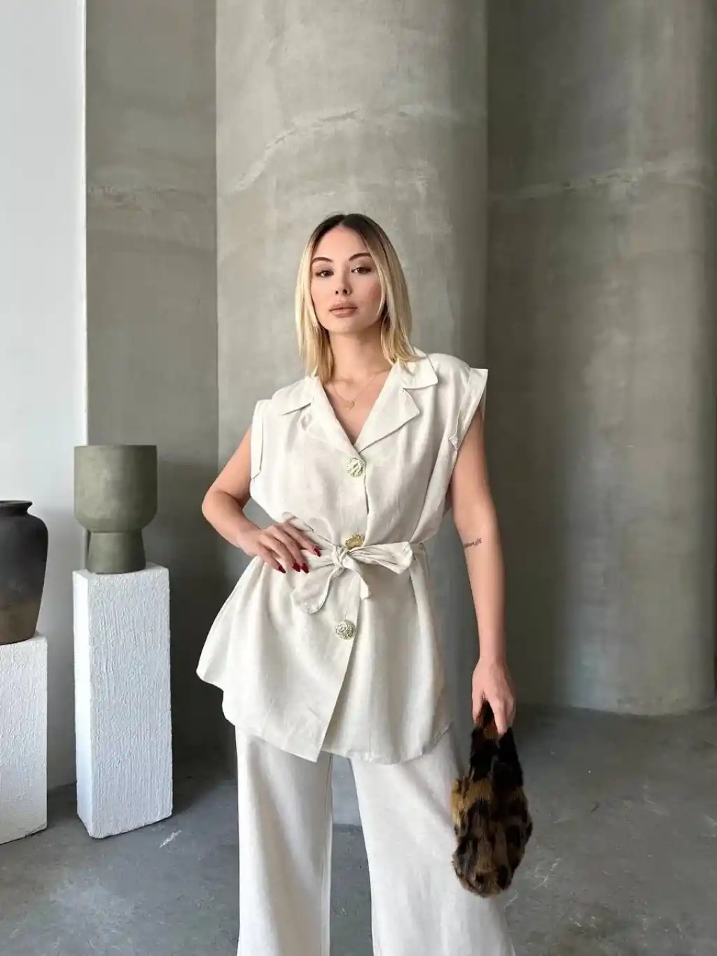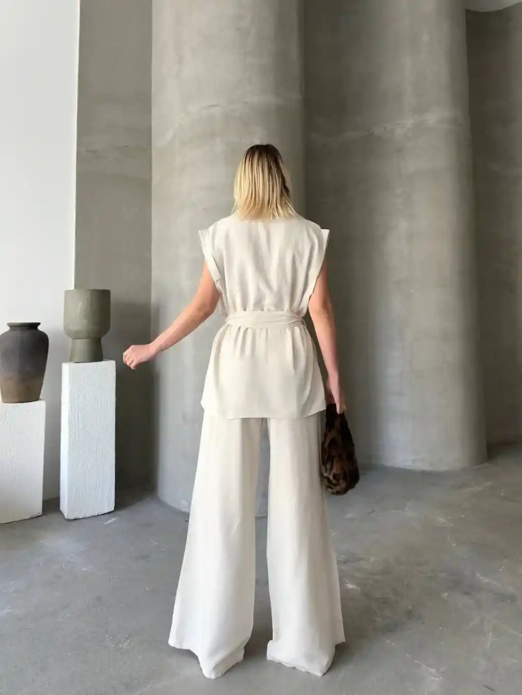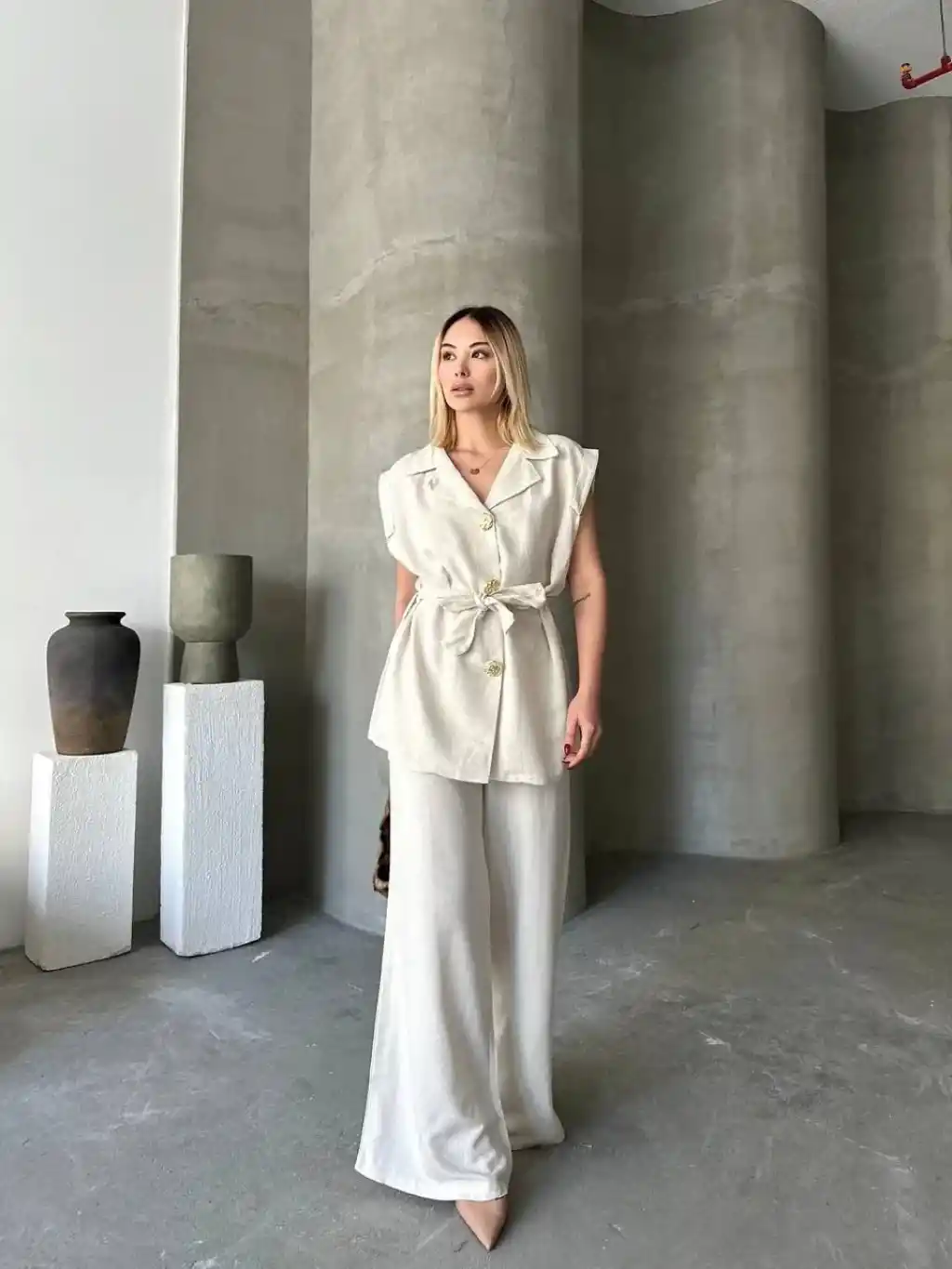 Keten Sıfır Kol Kuşaklı Ceket Pantolon ikili Takım - Beyaz