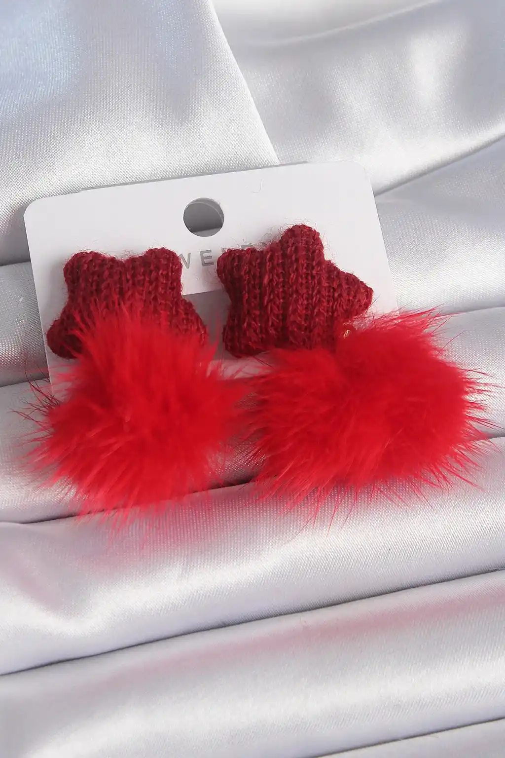 Kırmızı Renk Tüylü Yıldız Ponpon Model Kadın Küpe
