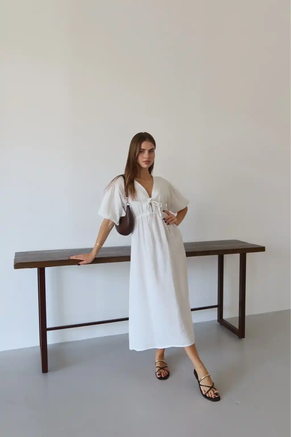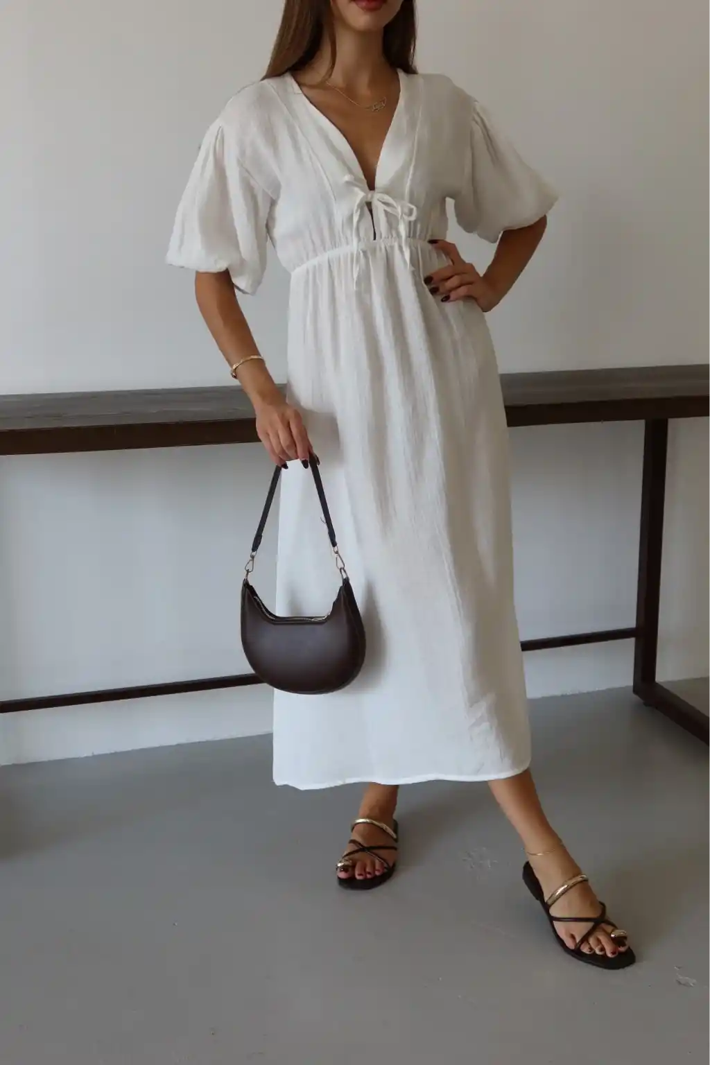 Askılı ch kumaş düğmeli elbise pudrabeyaz h265007
