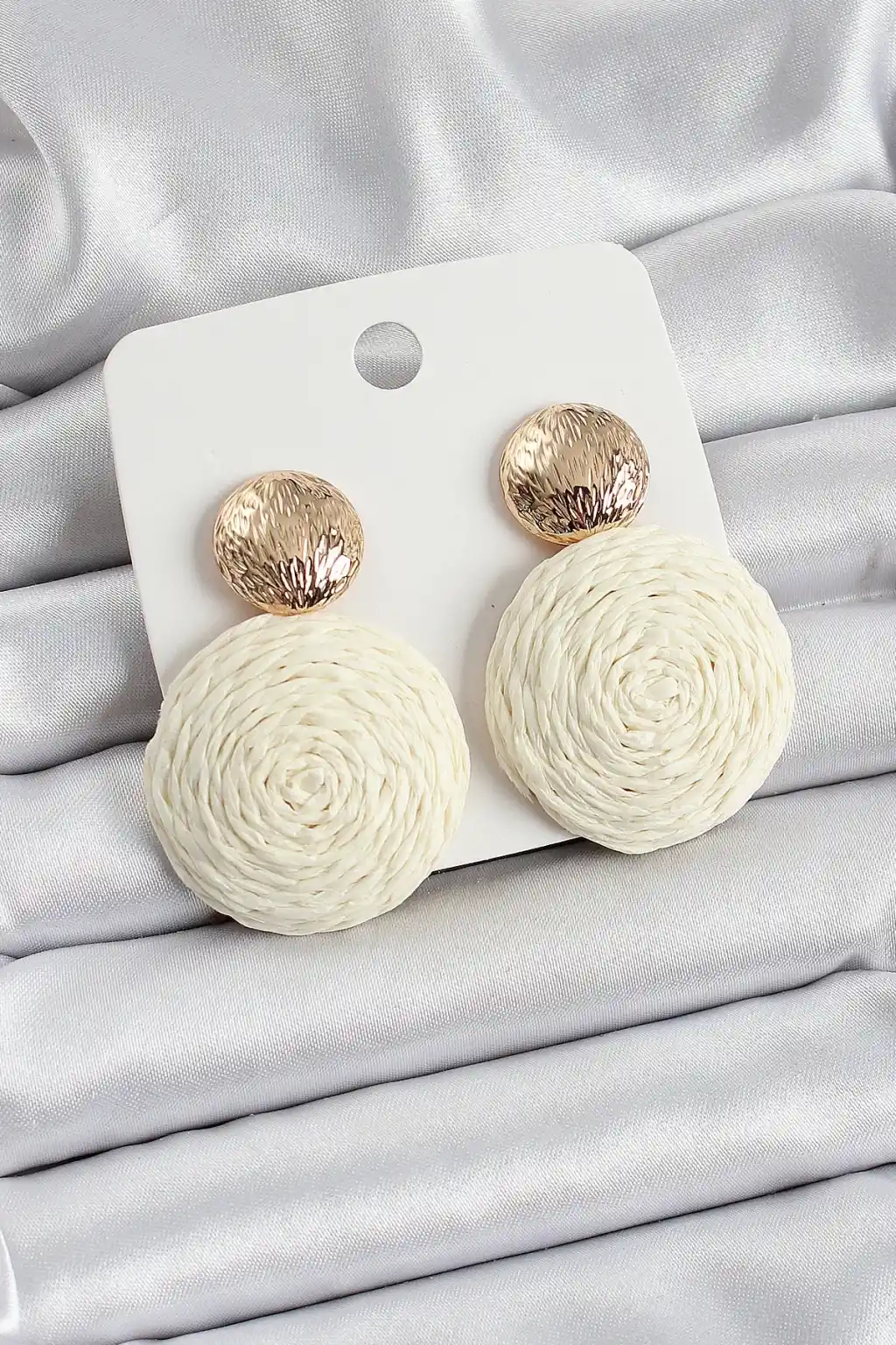 Krem Daire Figürlü Hasır Örgü Model Gold Renk Kadın Küpe