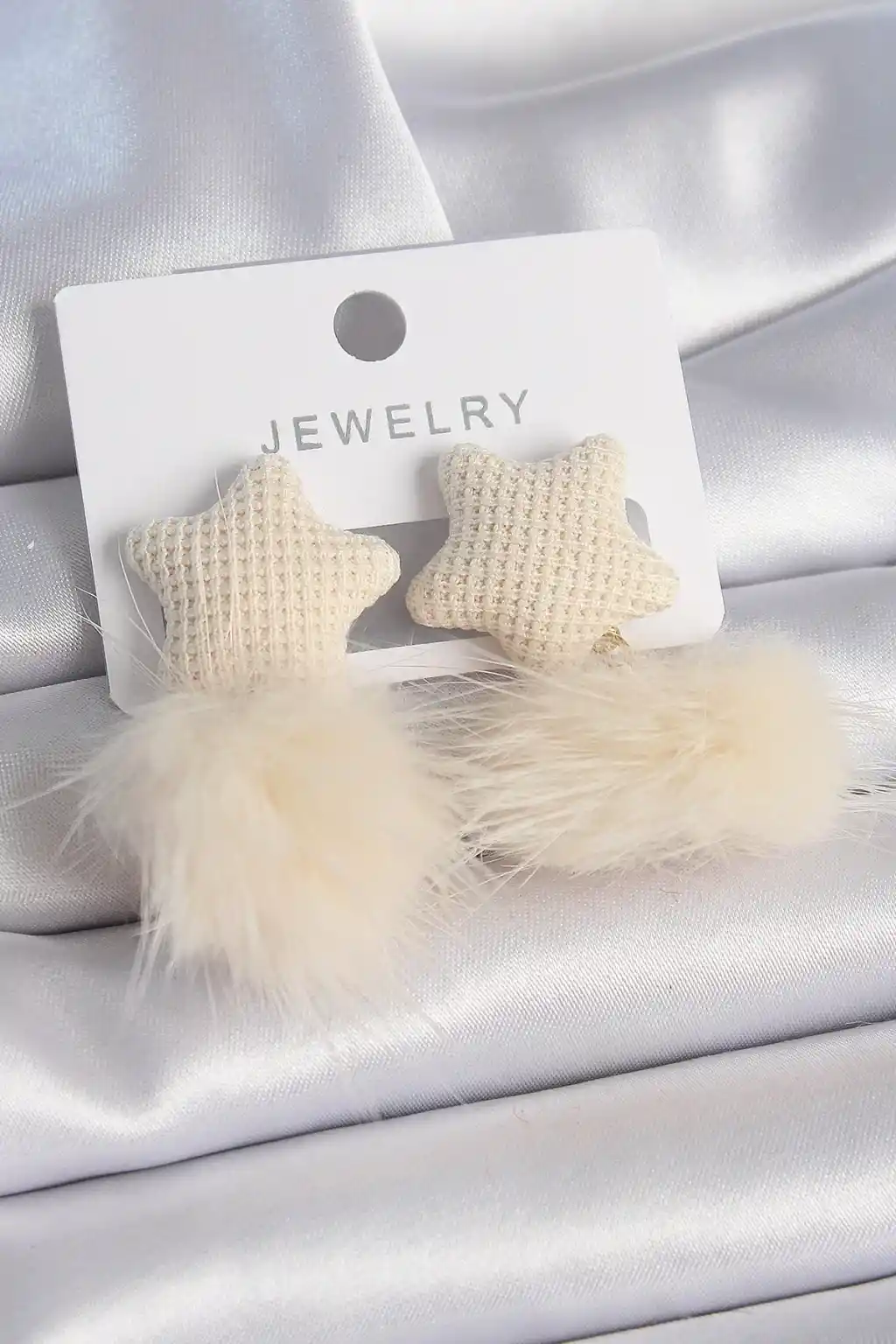 Krem Rengi Tüylü Ponpon Model Kadın Küpe