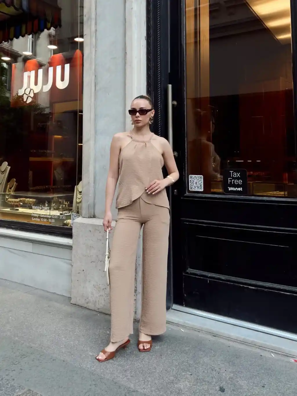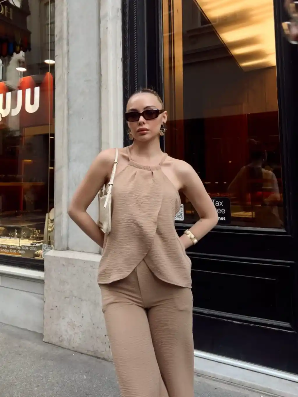 Bej rengiyle her kombinasyona uyum sağlayan s054 model takım, günlük kullanıma ve özel davetlere şıklık katar.