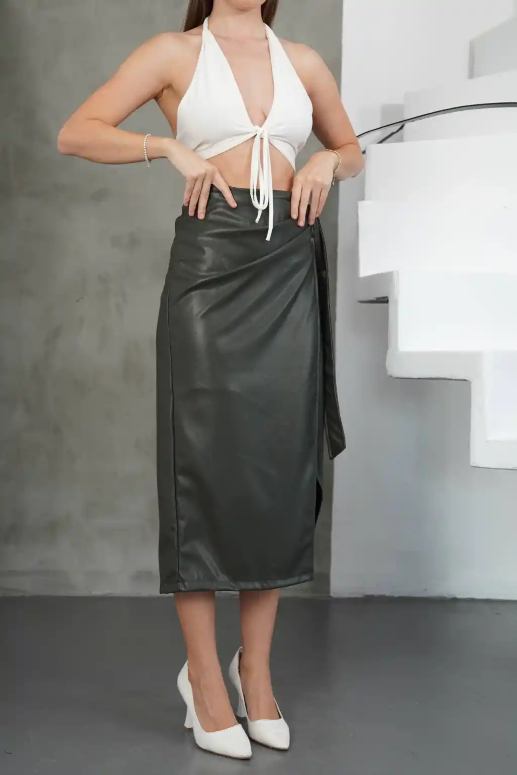 Şıklık ve rahatlığı bir arada sunan Kuşaklı Uzun Deri Etek Haki, gardırobunuzun vazgeçilmez parçalarından biri olmaya aday.
