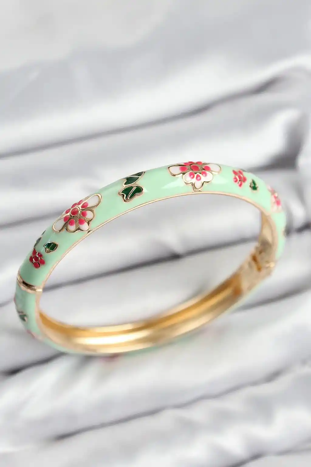 Mineli Pirinç Su Yeşili Çiçek Motifli Gold Kadın Kelepçe