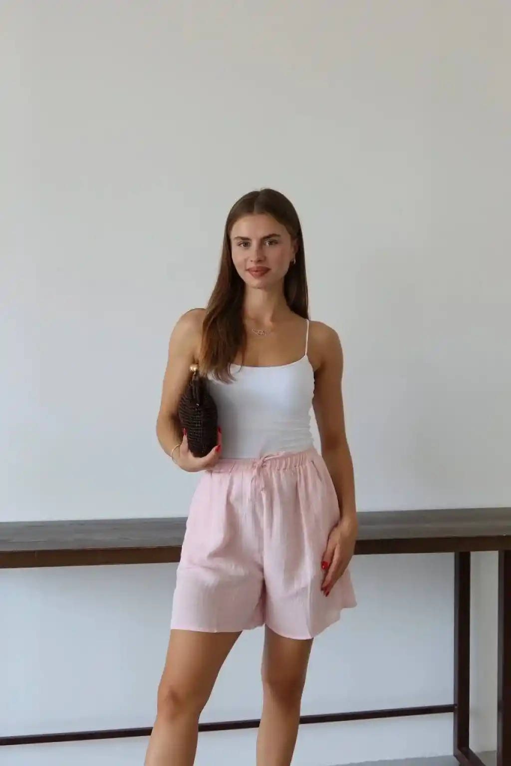 Müslin kumaş şort bağcıklı pembe pt