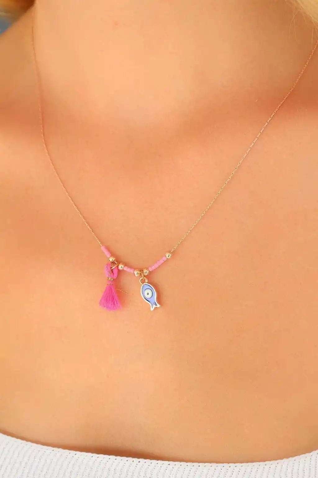 Nazar Boncuklu Pembe Renk Taşlı Rose Bayan Kolye
