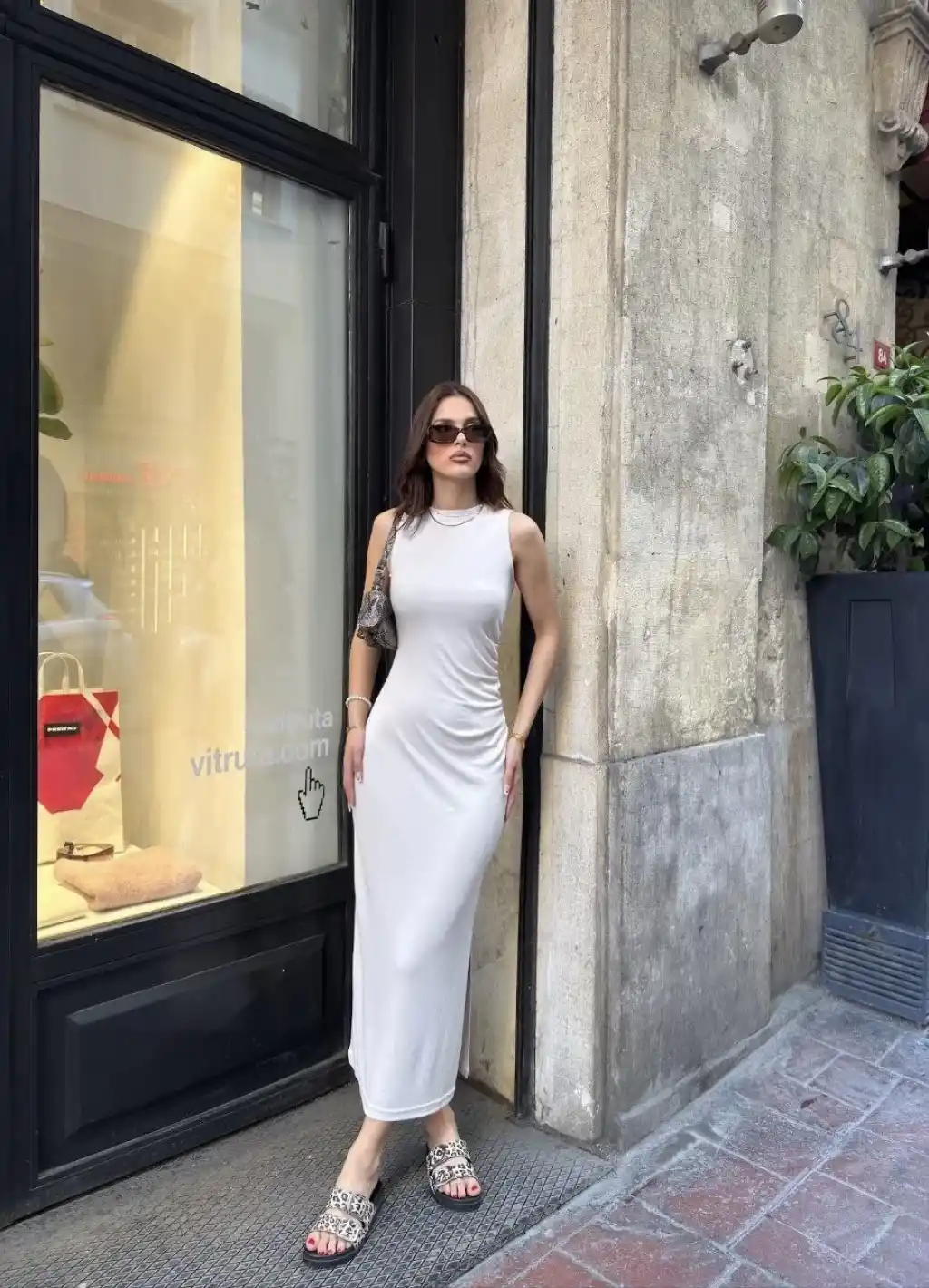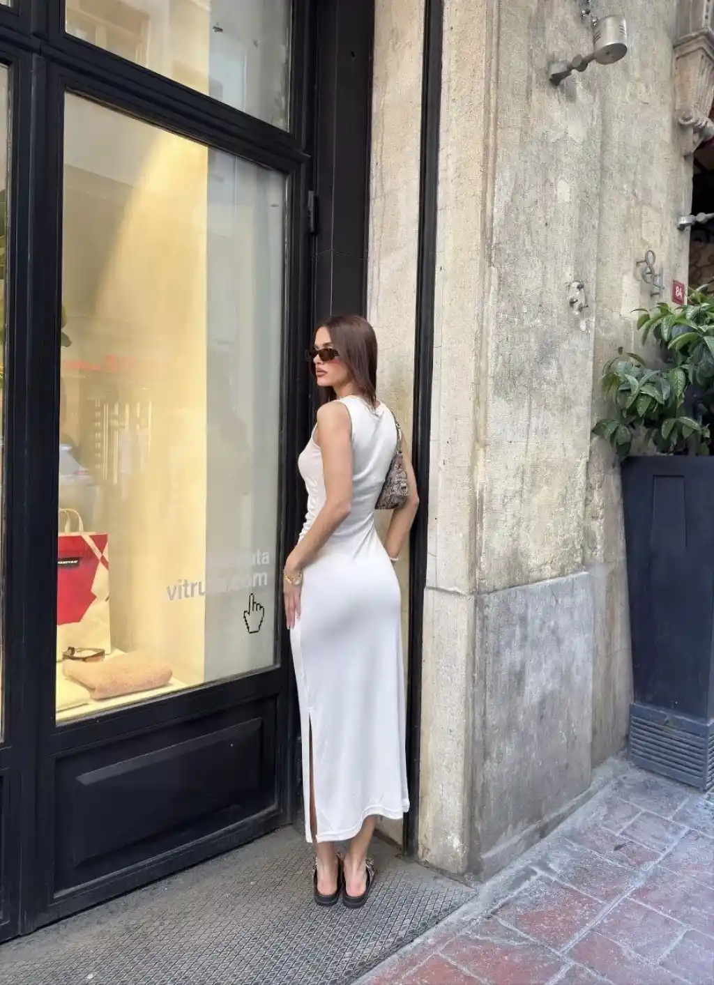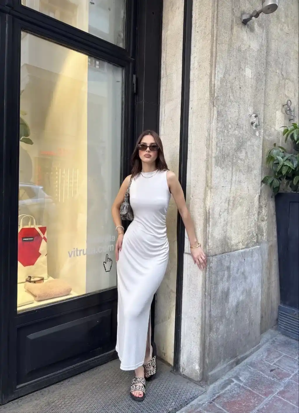 Osy Modal Yumuşak Dokulu Kumaş Bisiklet Yaka Sıfır Kolsuz Yırtmaçlı Uzun Elbise - Beyaz
