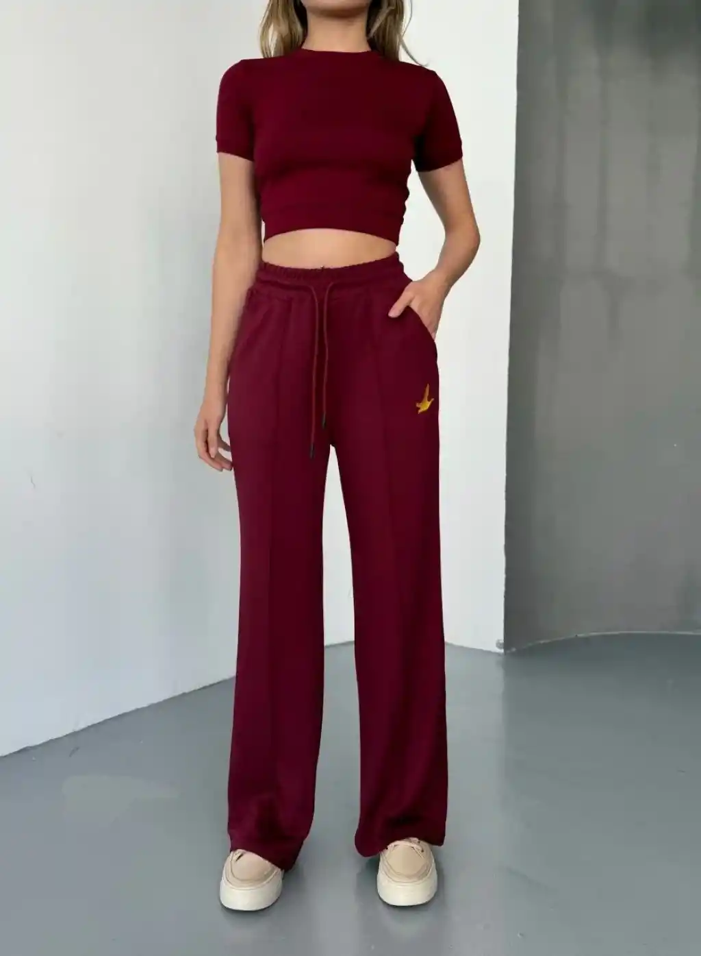 Osy Modal Yumuşak Dokulu Kumaş Nakış işlemeli Rahat Bol Paça Eşofman Pantalon - Bordo
