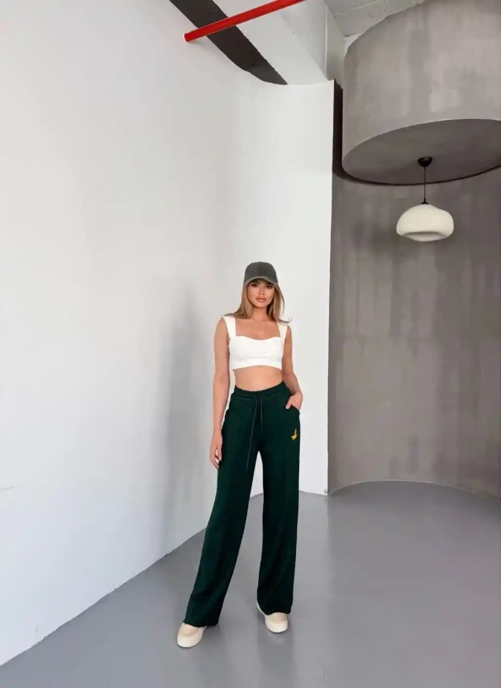 Osy Modal Yumuşak Dokulu Kumaş Nakış işlemeli Rahat Bol Paça Eşofman Pantalon - Yeşil