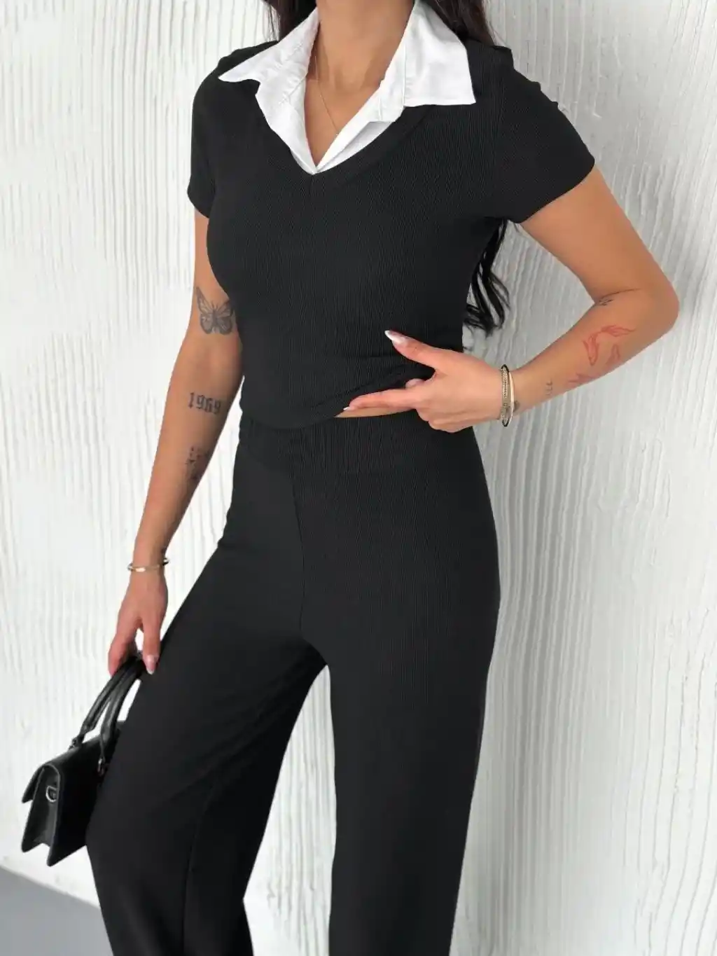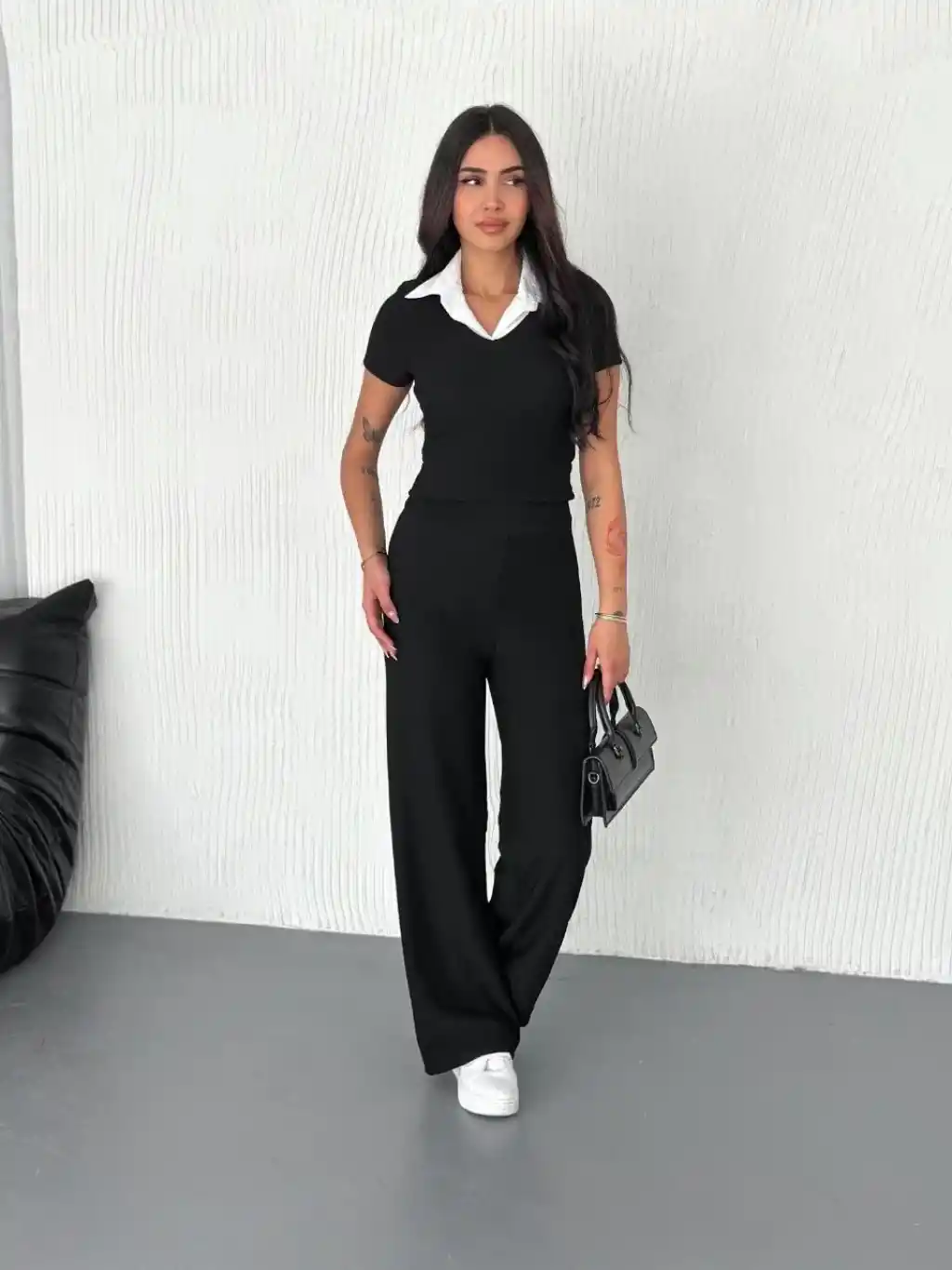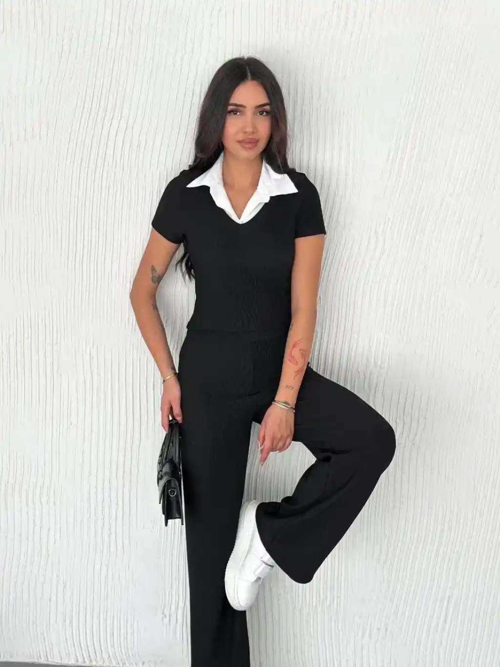 3 iplik içi Şardonlu yarım fermuarlı alt üst takım siyah
