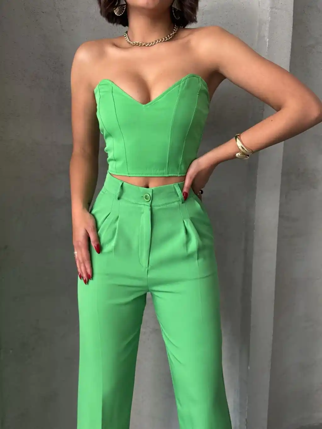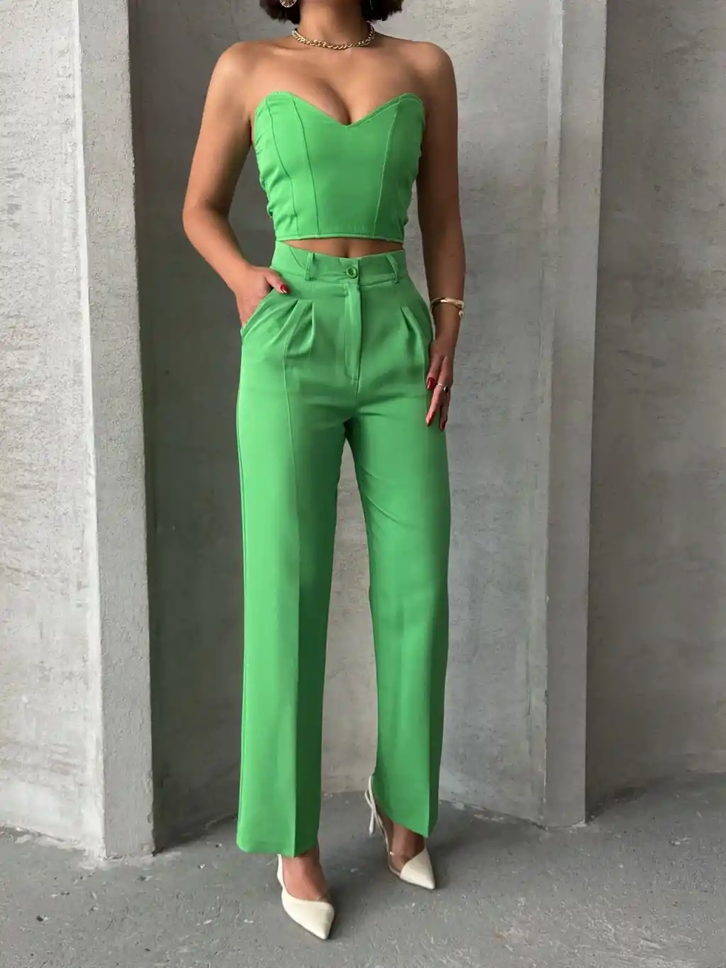 Yeşil Palazzo Pantolonlu Alt Üst Takım, şıklık ve rahatlığı bir arada sunuyor.