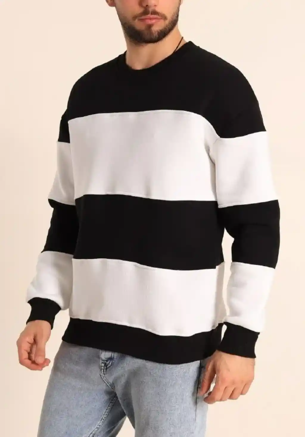 Parçalı Bisiklet Yaka Baskılı SweatShirt - Siyah