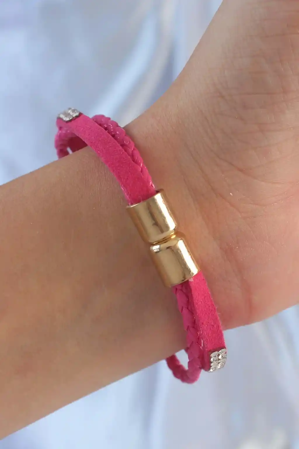 Pembe Renk Zirkon Taşlı Deri Çoklu Bileklik