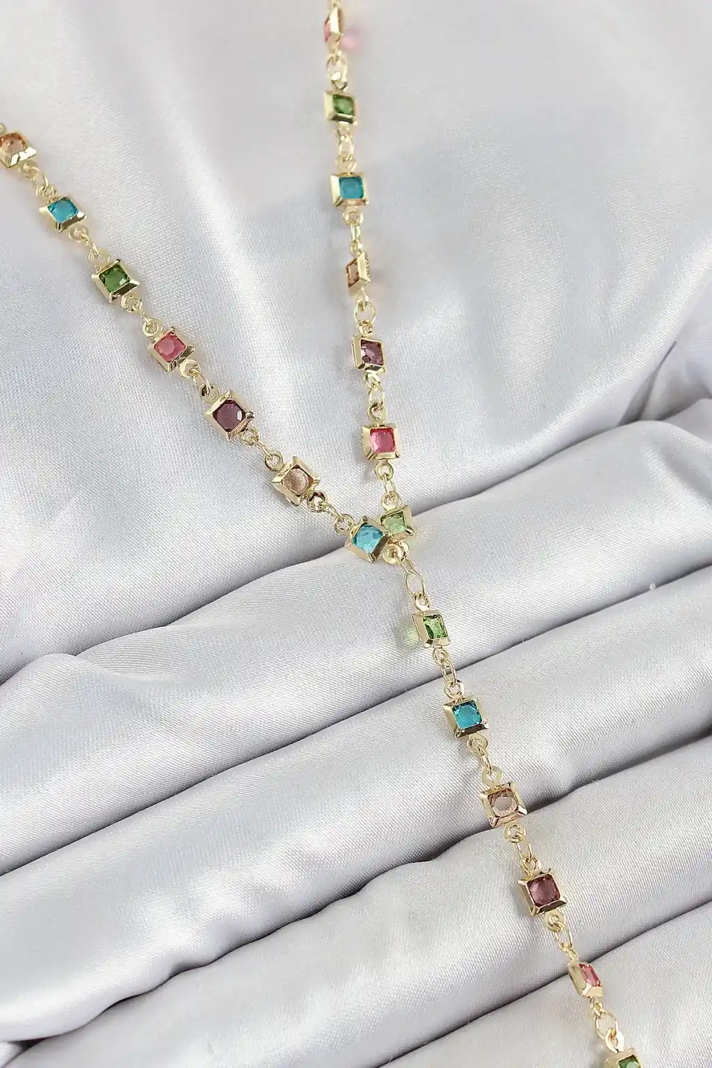 Pirinç Asorti Kare Model Gold Renk Zirkon Taşlı Y Kolye