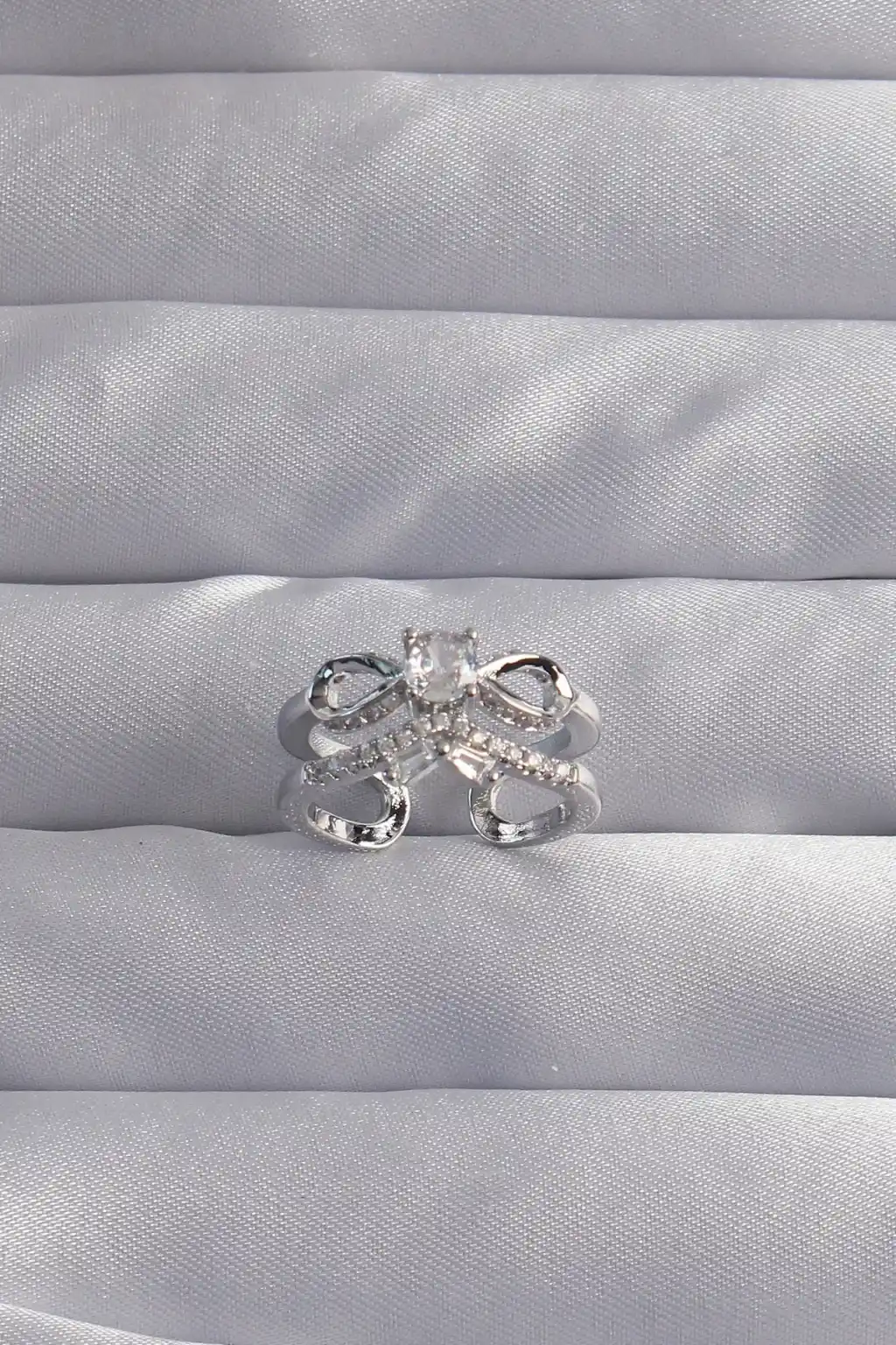 Pirinç Ayarlamalı Gümüş Renk Zirkon Taşlı 2li Görünüm Fiyonk Yüzük