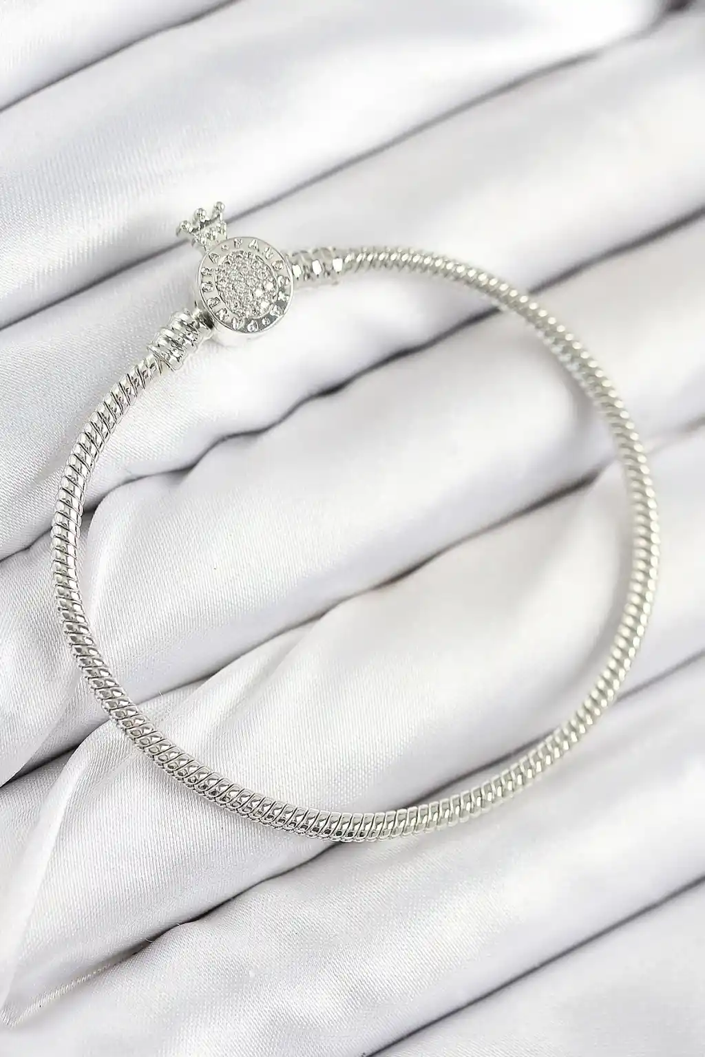 Pirinç Charm Zirkon Taşlı Taç Model Gümüş Renk Kadın Bileklik