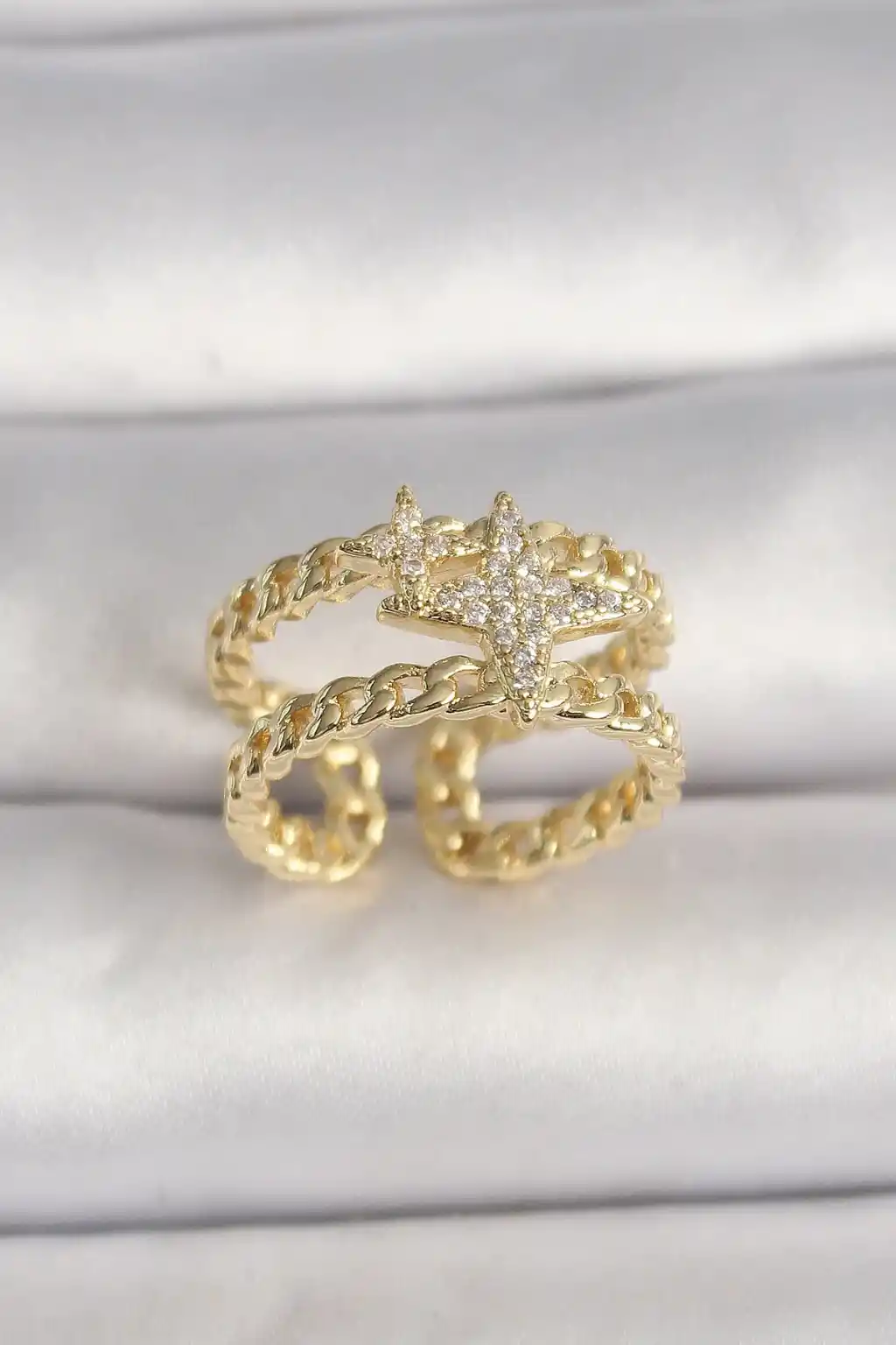 Pirinç Gold Renk 2'Li Zincir Zirkon Taşlı Yıldız Figür Kadın Yüzük