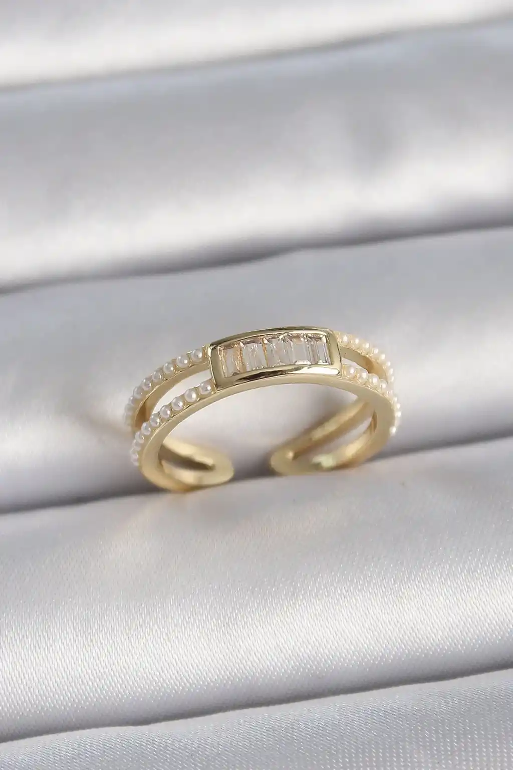 Pirinç Gold Renk Ayarlanabilir Sıralı İncili Zirkon Taş Detaylı Kadın Yüzük