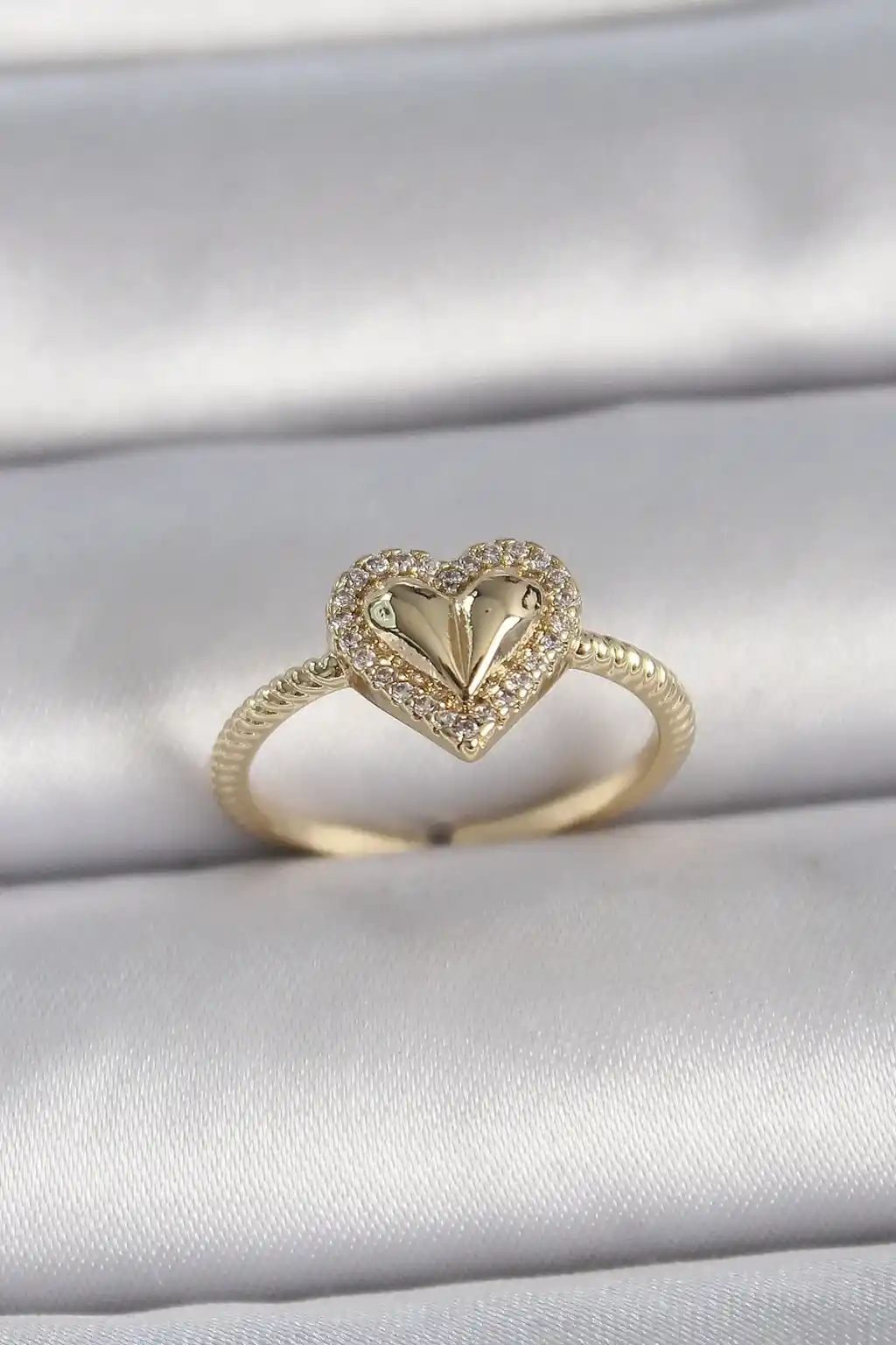 Pirinç Gold Renk Ayarlanabilir Zirkon Taşlı Kalp Model Kadın Yüzük