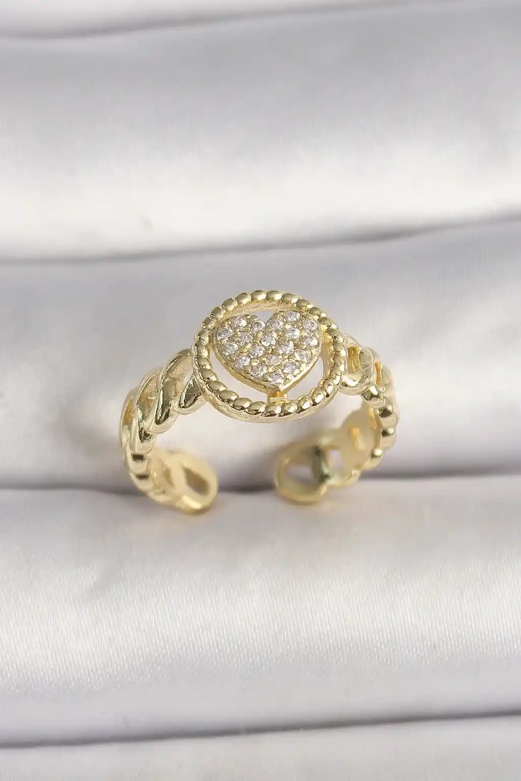 Pirinç Gold Renk Ayarlanabilir Zirkon Taşlı Kalp Model Kadın Yüzük